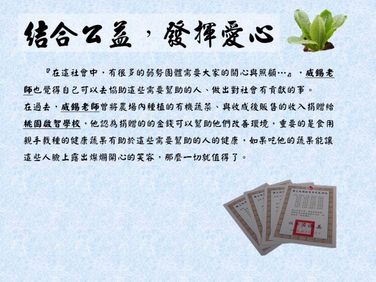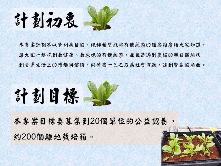 本計畫希望能將有機蔬菜的理念推廣給大家知道,讓大家一起吃到最健康、最原味的有機蔬菜,並且透過到農場的親自體驗找到更多生活上的樂趣與價值,並且透過有機與公益結合,盡一己之力為社會貢獻,達到雙贏的局面。