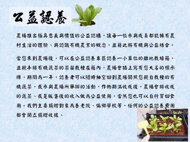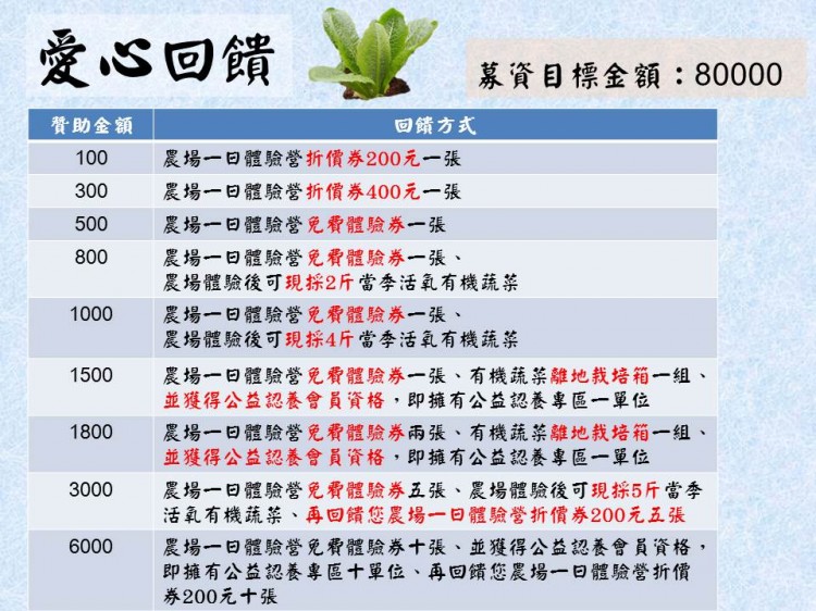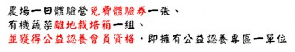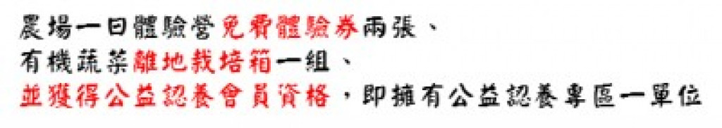 農場一日體驗營免費體驗券兩張、 有機蔬菜離地栽培箱一組、 並獲得公益認養會員資格,即擁有公益認養專區一單位