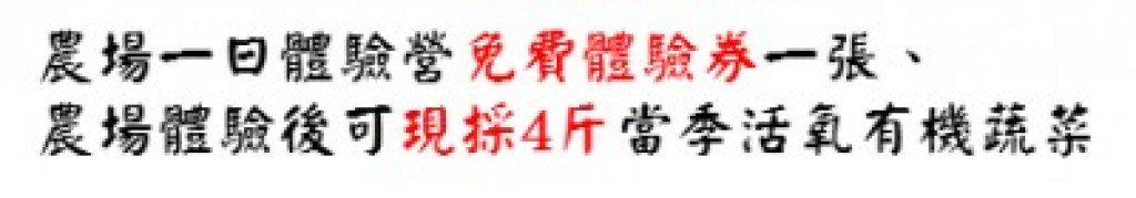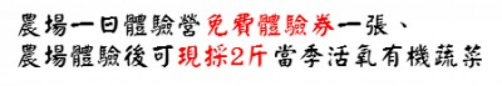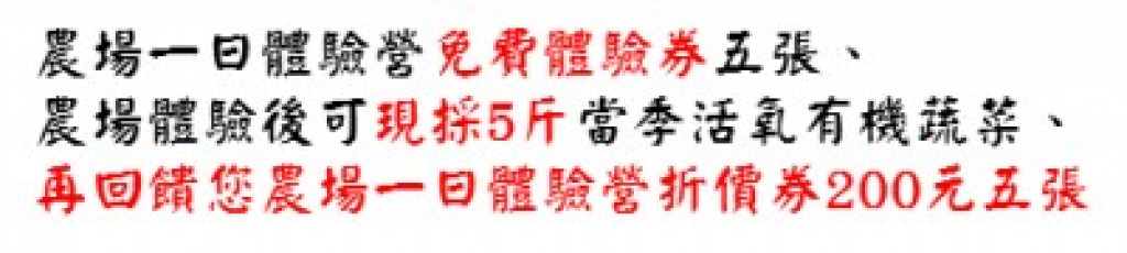 農場一日體驗營免費體驗券五張、 農場體驗後可現採5斤當季活氧有機蔬菜、 再回饋您農場一日體驗營折價券200元五張