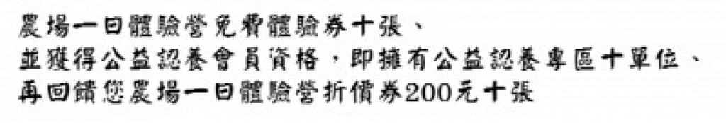 農場一日體驗營免費體驗券十張、 並獲得公益認養會員資格,即擁有公益認養專區十單位、 再回饋您農場一日體驗營折價券200元十張