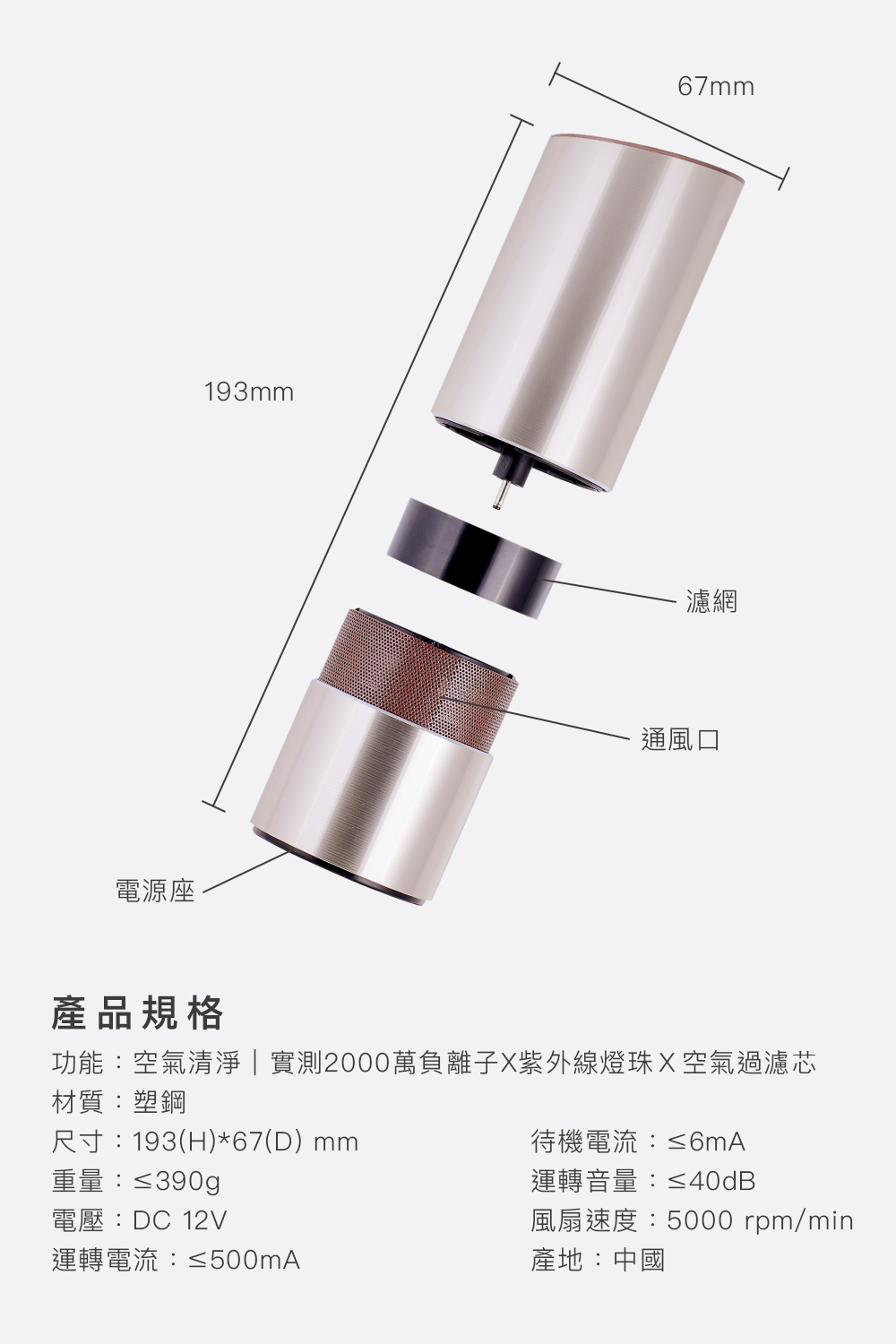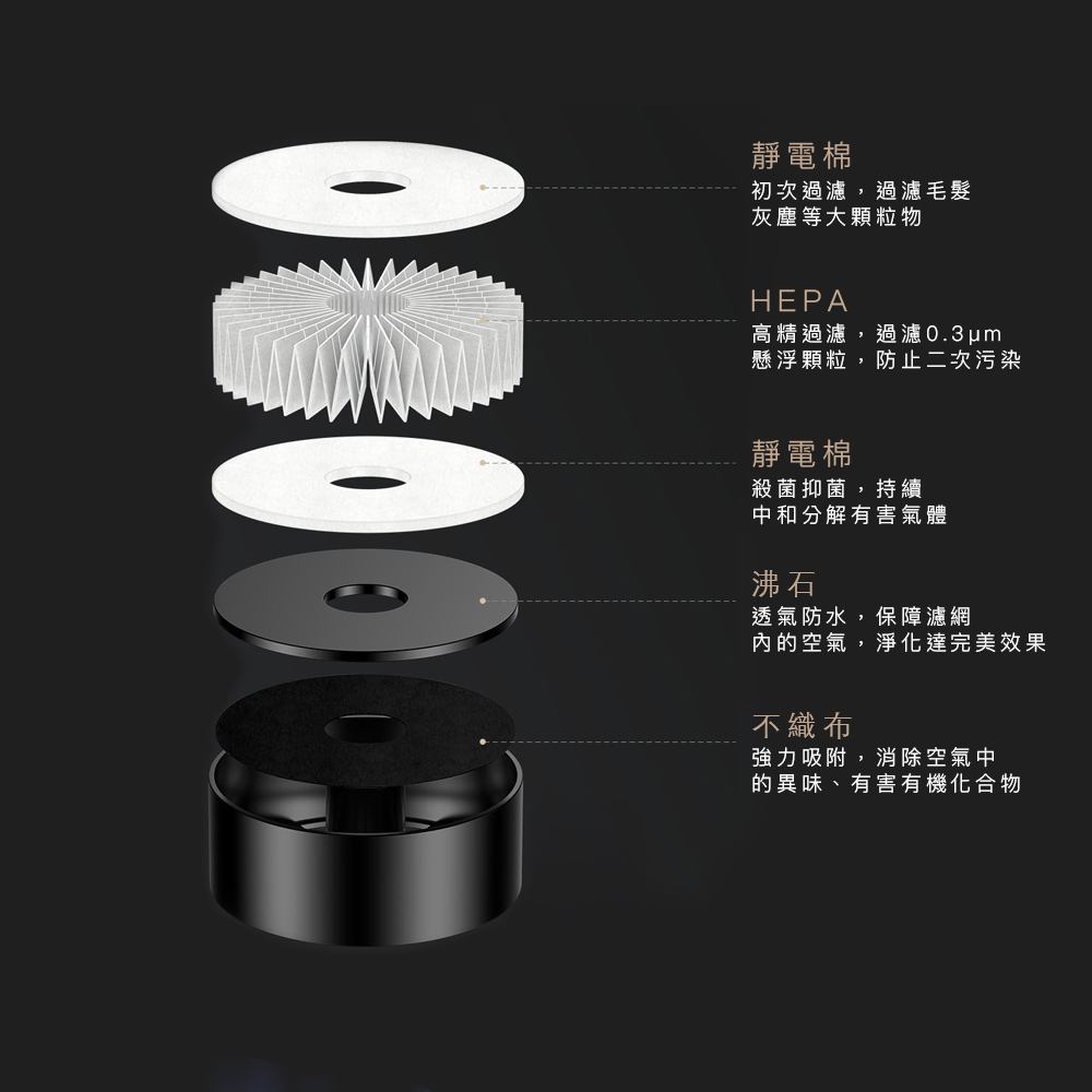 物理排除污染源,具備HEPA等級核心濾網,可吸附空氣中的微小分子、有效過濾99.97%空氣中的pm2.5與灰塵,排出乾淨的空氣,即使在車內及室內都能享受更清新的呼吸體驗。
