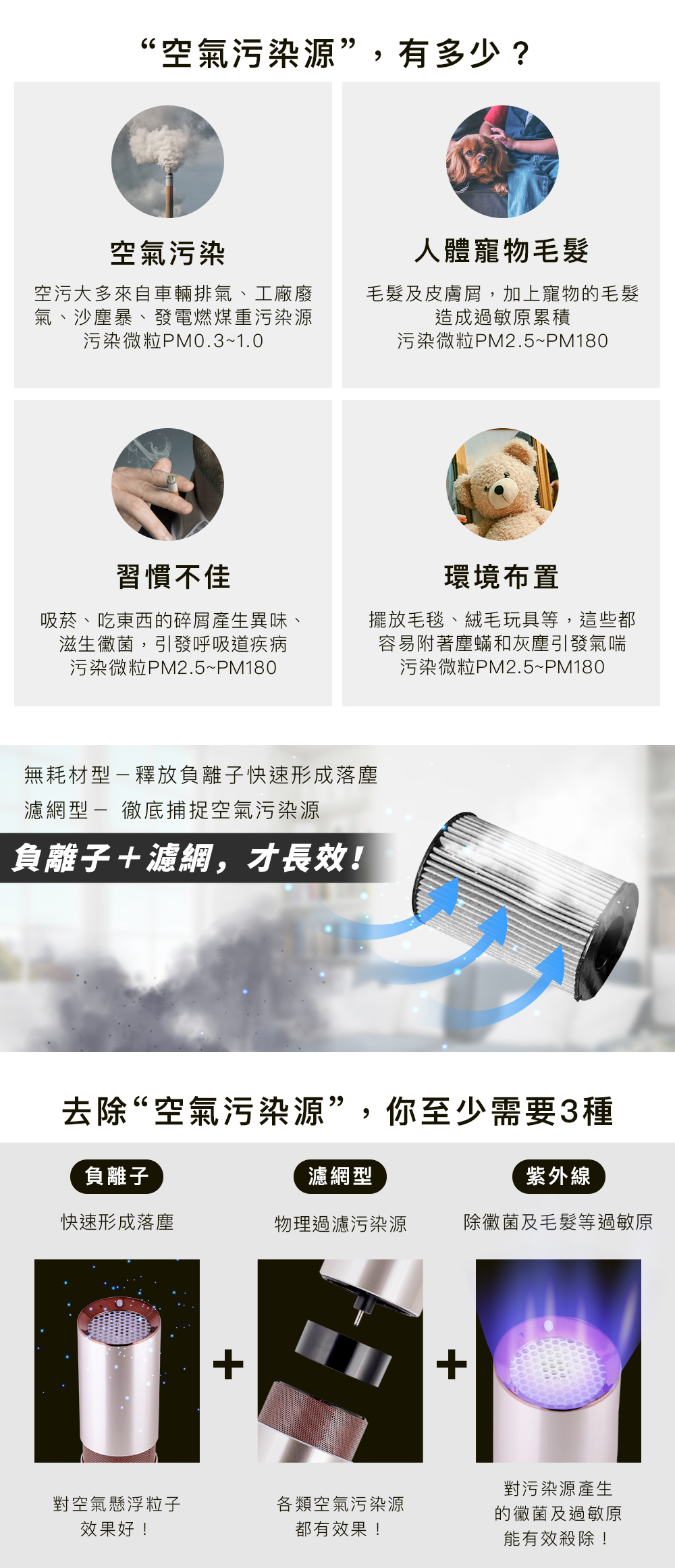 在科技發達的現代社會,空氣品質逐漸下降,民眾也逐漸意識到空汙問題可能造成呼吸疾病,為了讓健康更全面,將負離子、空氣過濾、紫外線殺菌三項功能整合在一起,即使封閉的小環境中也能擁有清新乾淨的好空氣。