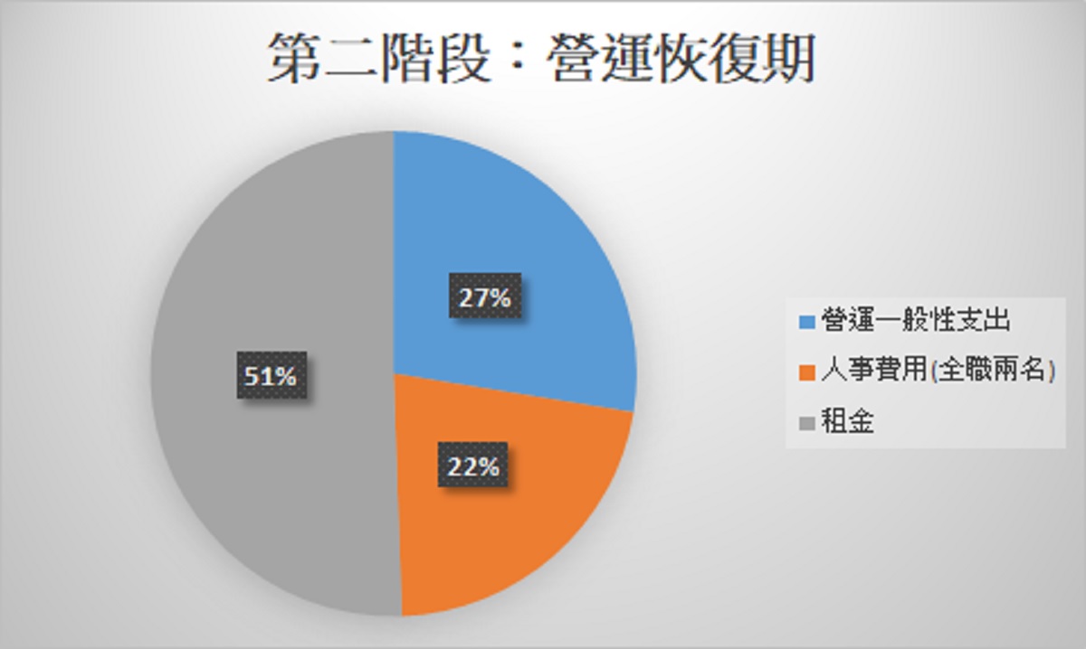 營運重啟後,每月營收將足以支付一般性營運費用外,將可視狀況增加一位人員。預估需要約三個月。