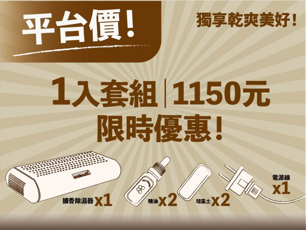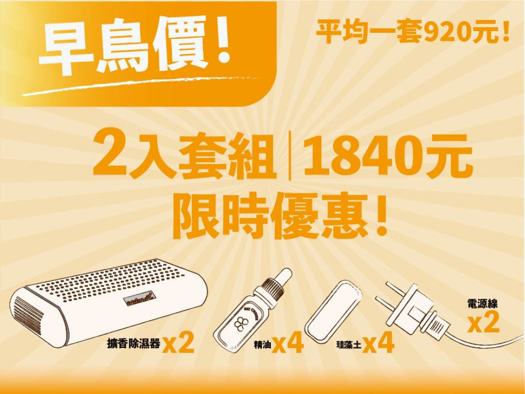 本產品分為除濕器與擴香蓋。除濕器可透過加熱重複使用,擴香蓋內部有硅藻土塊,可滴上精油,由於硅藻土的特性,當環境越發乾燥時,它越能散發經由的香氣。且本產品設計巧思為,當要將除濕器還原重複使用時,需先將擴香蓋拆下,才能插進插頭進行加熱,避免擴香蓋因加熱時產生的溫度而效果下降,也能在加熱同時補充精油,一舉兩得。