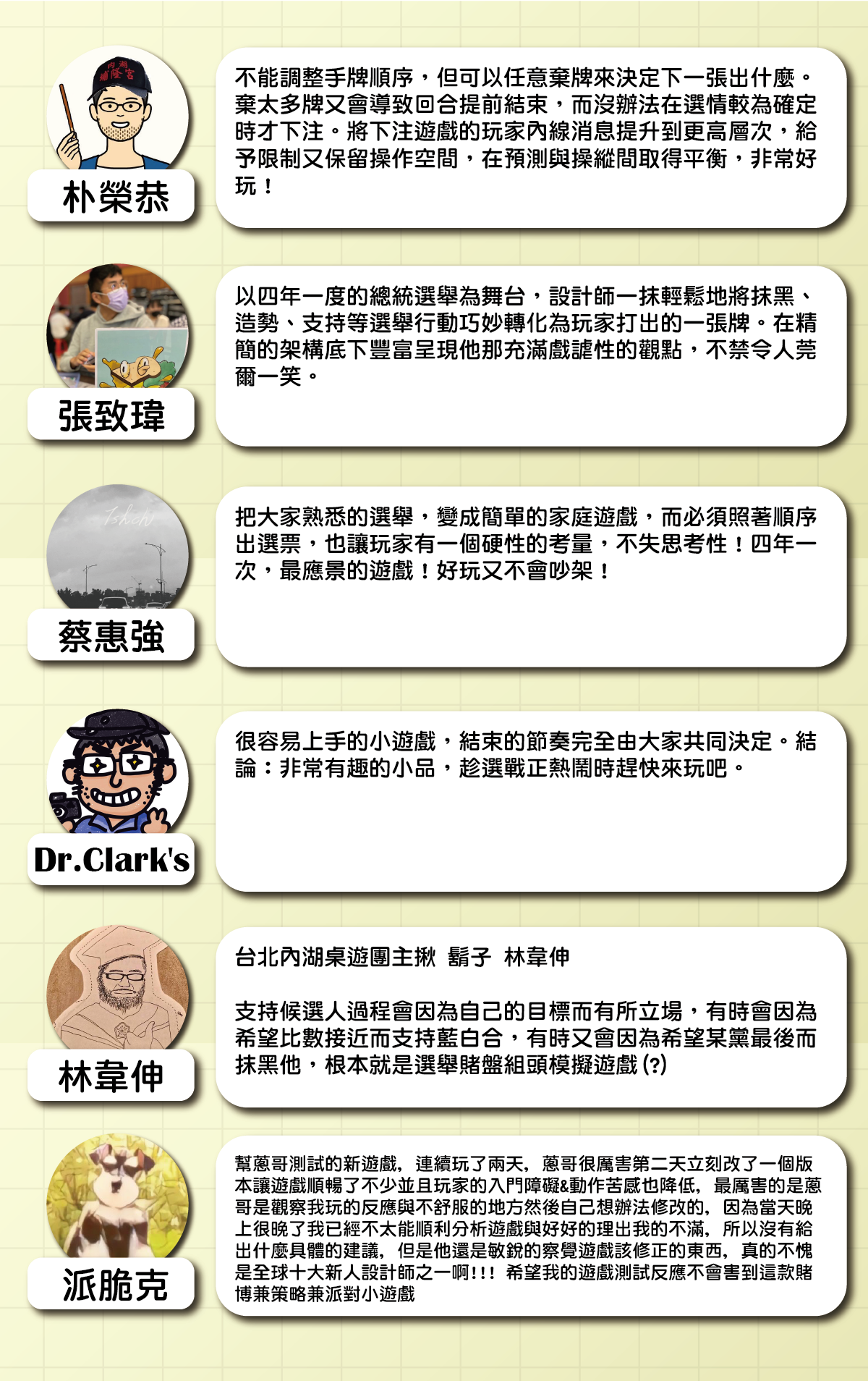 • 風險評估: 玩家需隨時評估選舉風向,搭配手上的影響力卡,精準下注,冒險與謹慎並存,才能在結算時脫穎而出,成為勝利的政治角力者