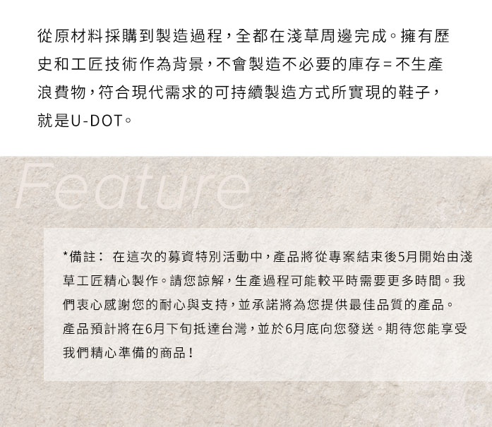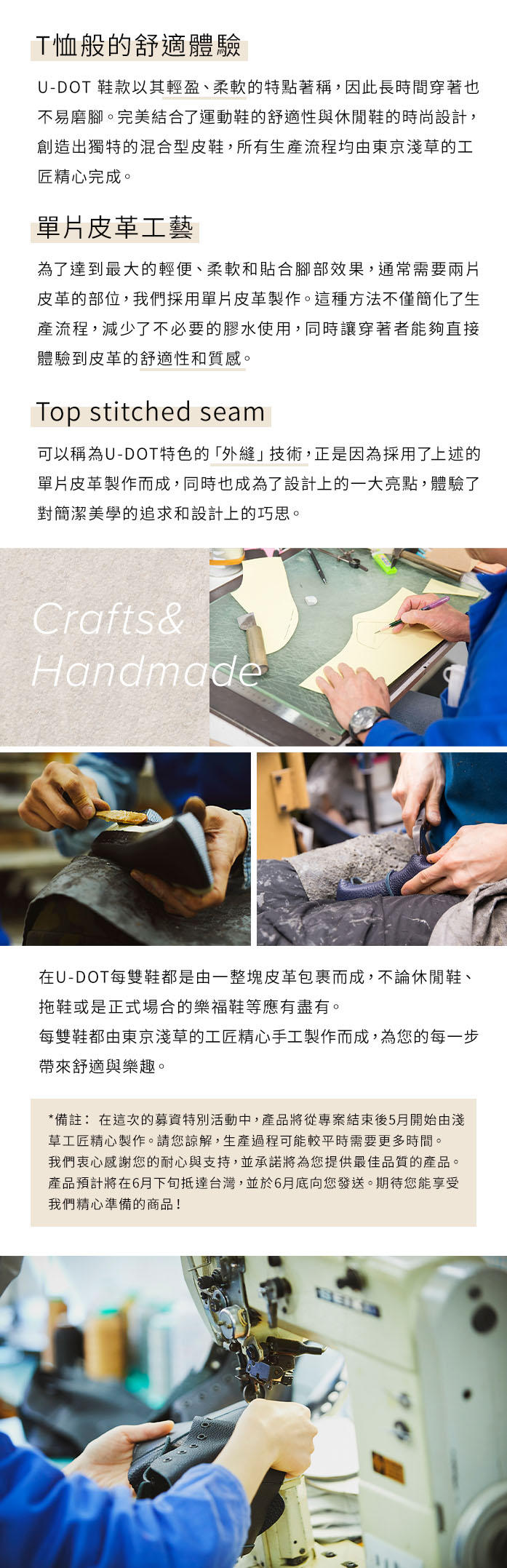 現在,淺草這個因雷門等觀光地而聞名的地方,仍有超過100家鞋廠在運營,革和鞋材等許多製造商也聚集於此。大部分的日本製皮鞋至今仍在淺草製作。如此以鞋業為主的城市在歐美幾乎罕見,英國的北安普敦只剩下幾家。東京有超過10所專門學校教授製鞋技術,許多學生,包括外國人,都在這裡學習製鞋。U-DOT正是在這樣的淺草鞋城中,日復一日地積累經驗,並滿懷心意製作而成。