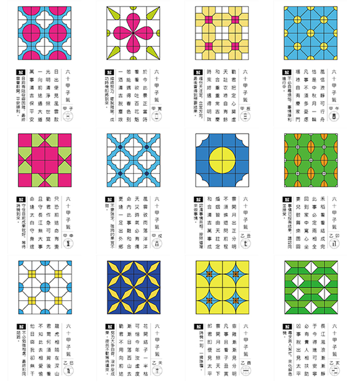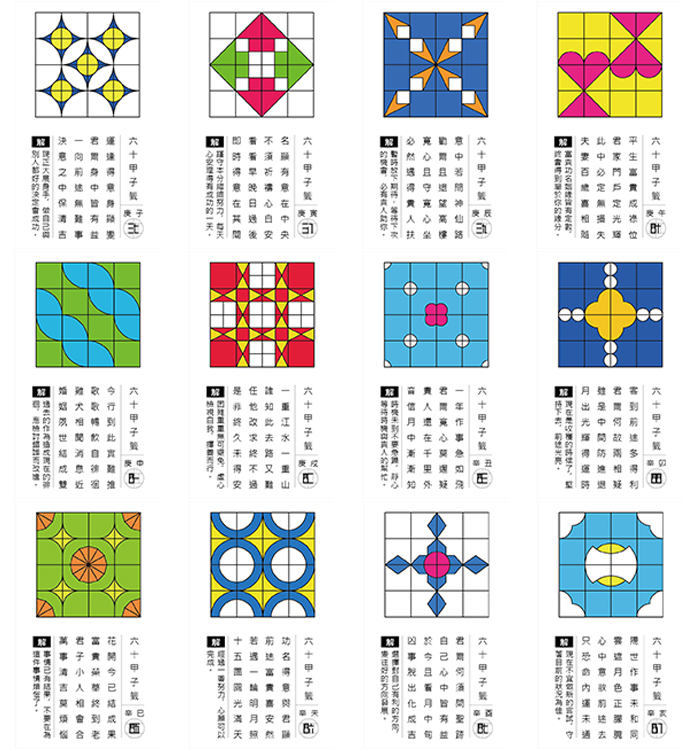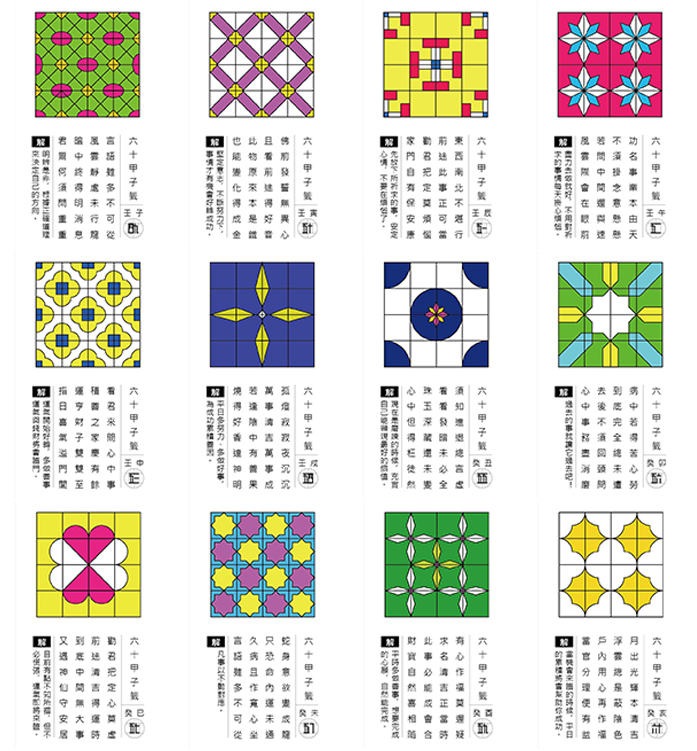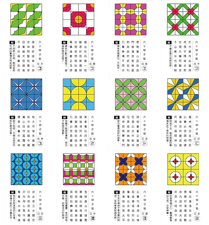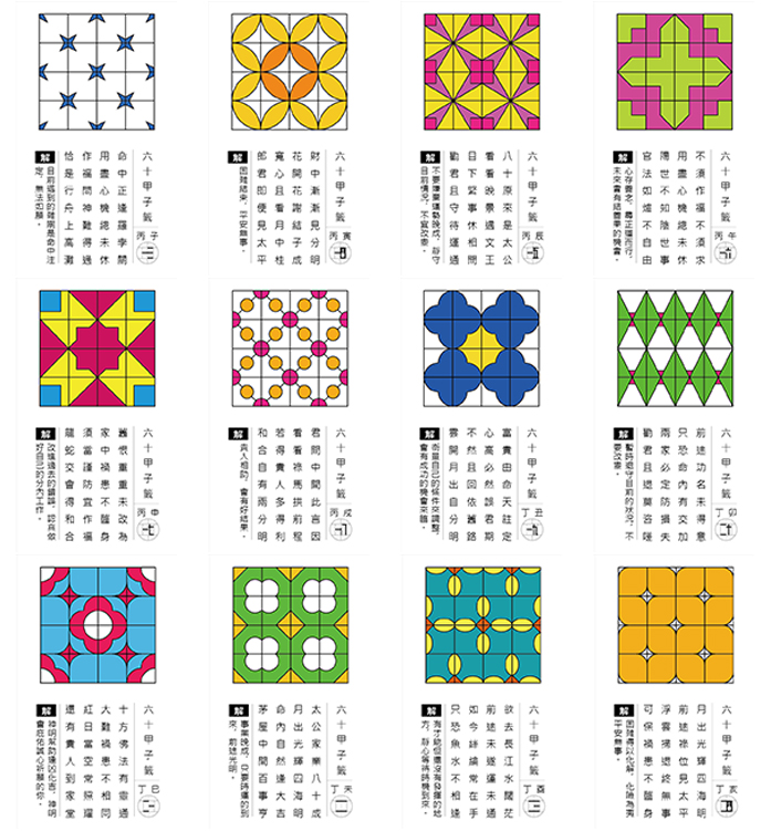 籤詩使用六十甲子媽祖靈籤,是台灣廟宇最常見的籤詩之一,圖案則是用台灣花磚的圖案單元,依據籤詩之意,設計出台灣花磚風格圖案。