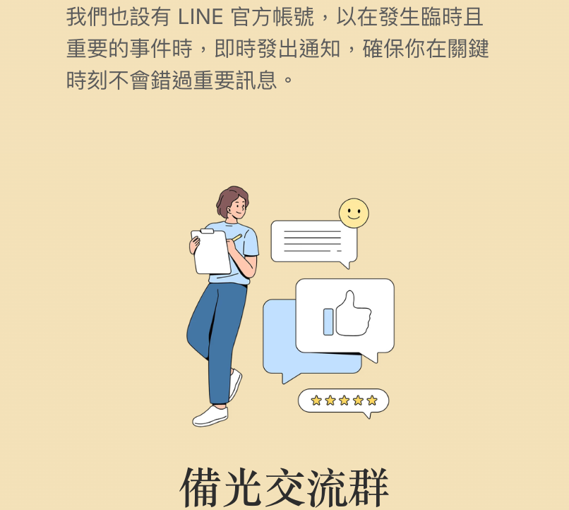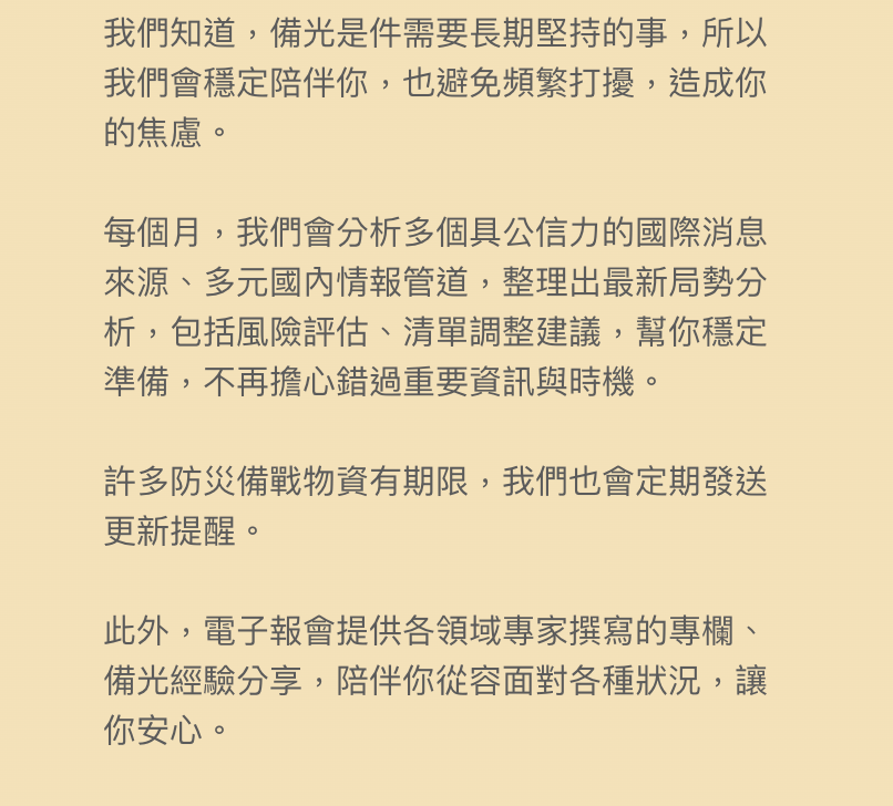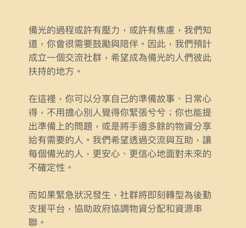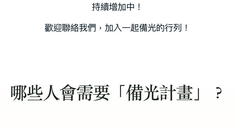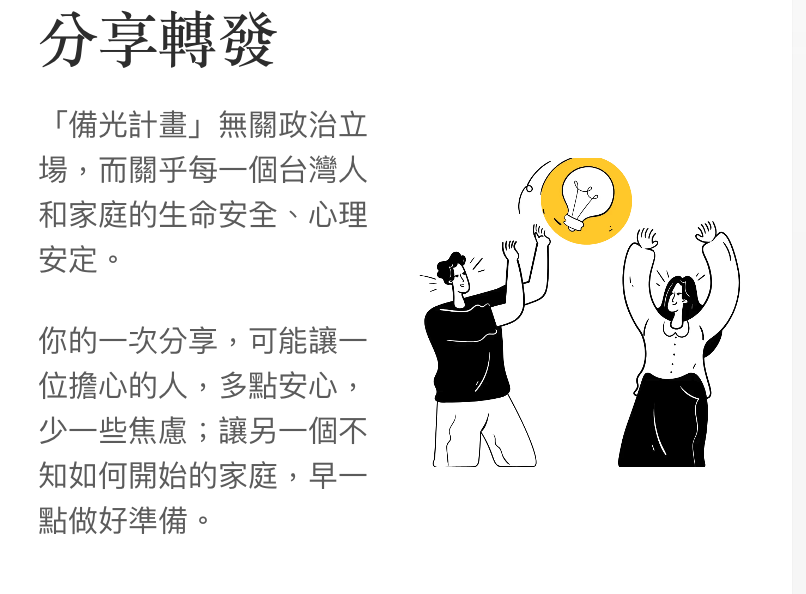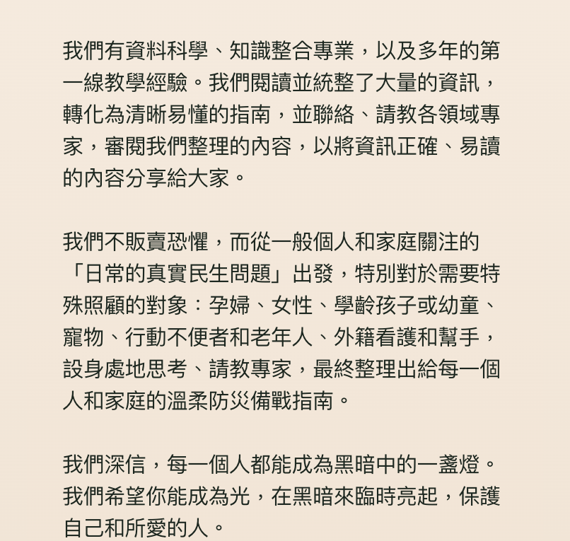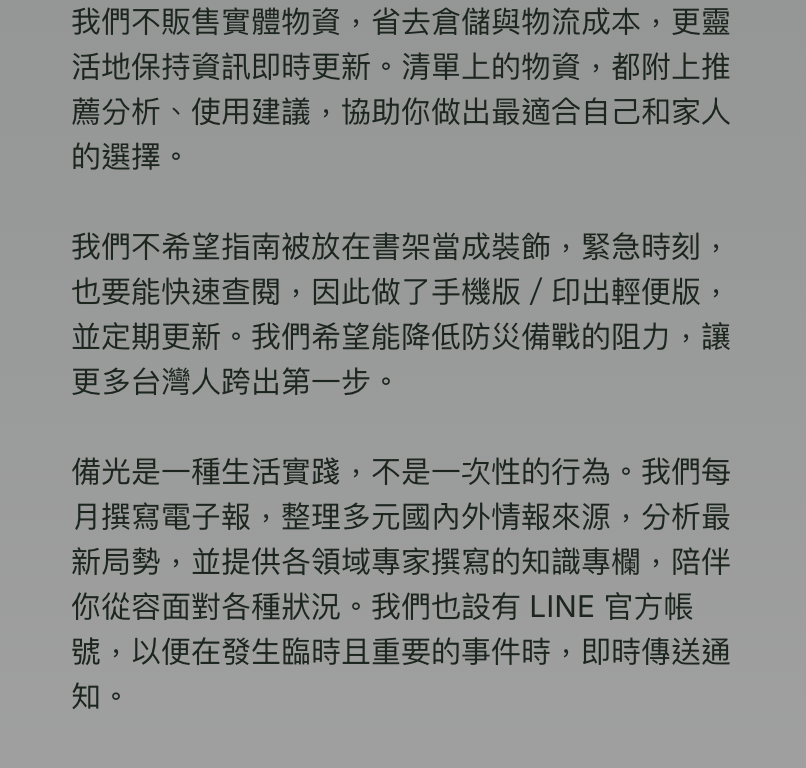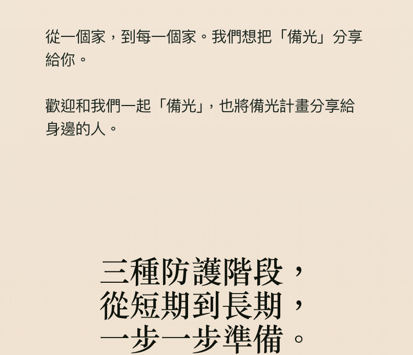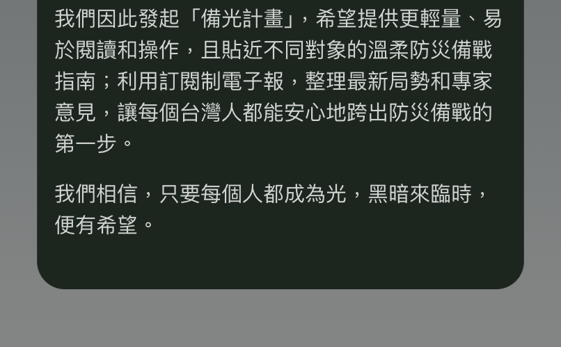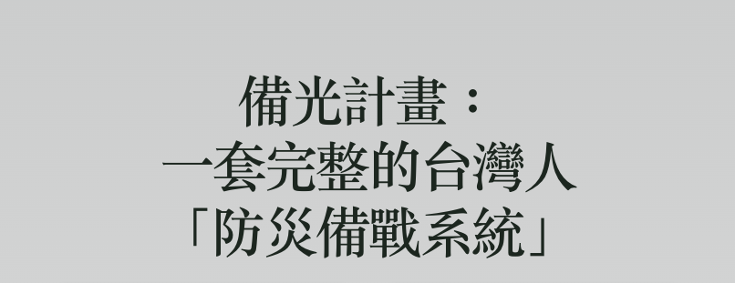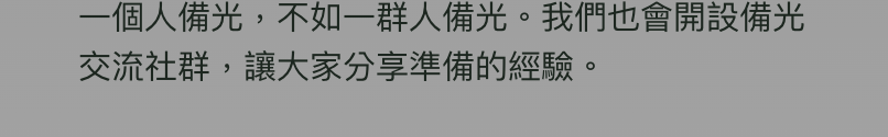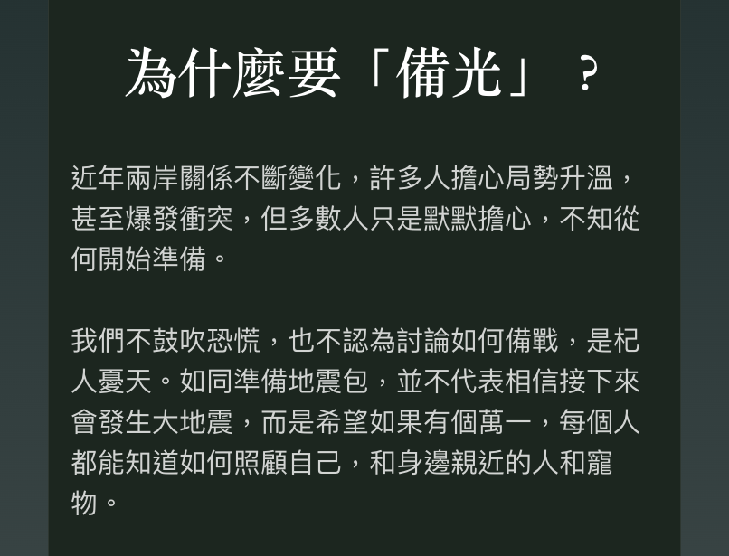 我們相信,透過分享備光,更多台灣人能提前做好準備。如果黑暗來臨時,準備的光就能帶來希望。