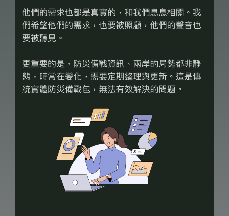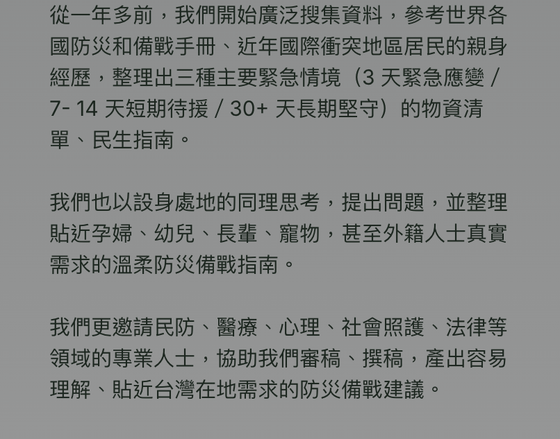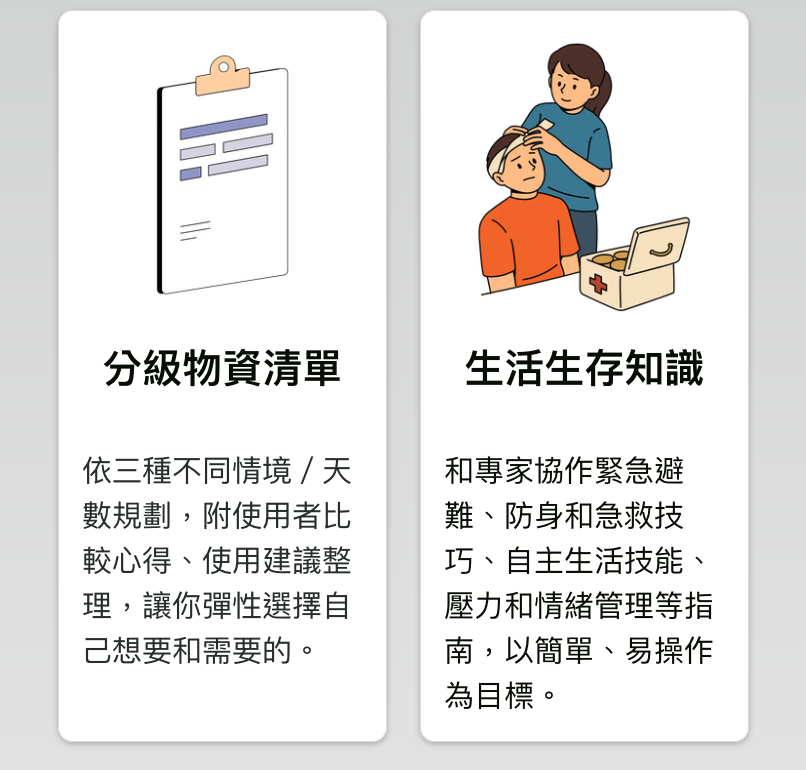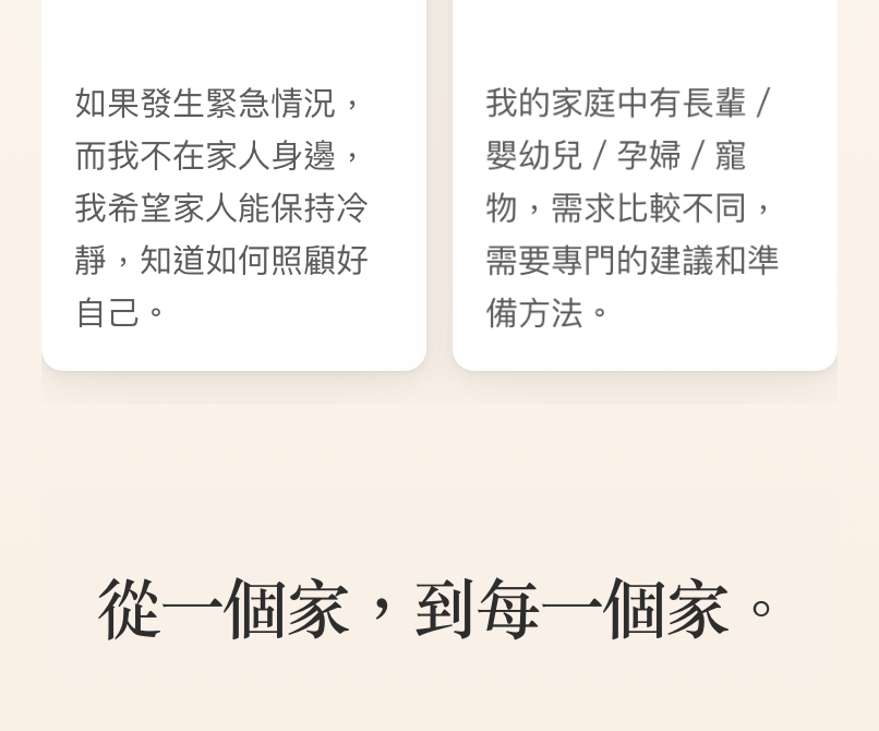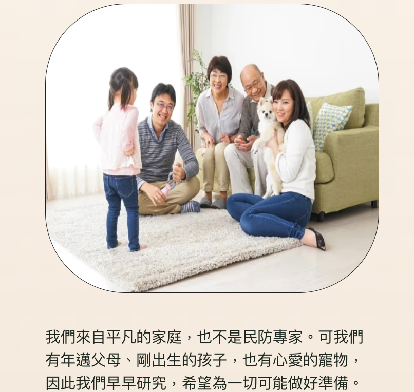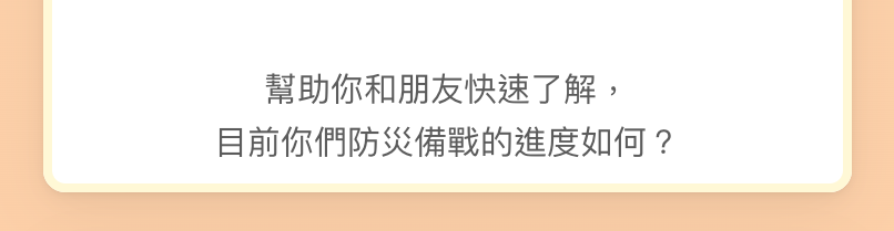 感謝你,你的參與,不僅協助我們深化並推廣備災理念,也讓你能將安心、不煽動恐懼的備災方法,送給你關心和所愛的人。