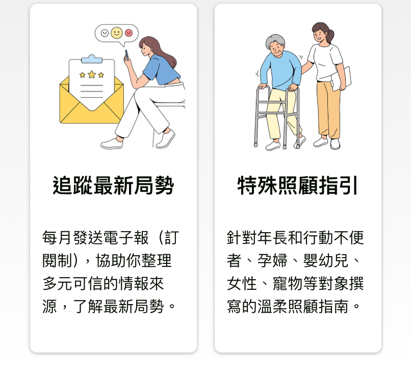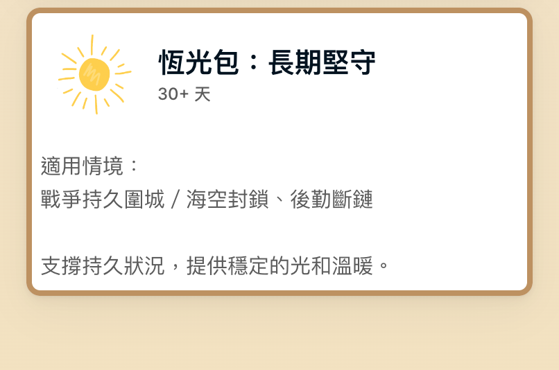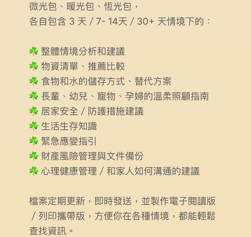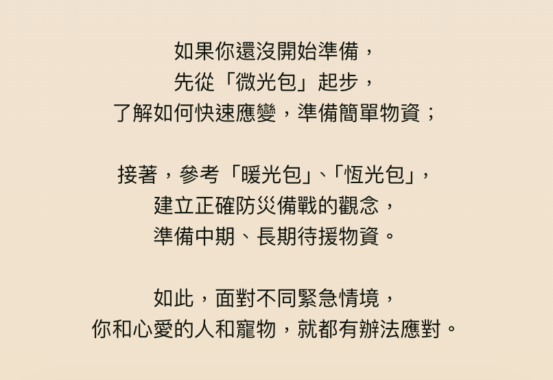 謝謝你支持備光計畫的「暖光包」!你的支持將幫助我們特別為女性、孕婦、老人、幼兒、寵物、外籍人士等常被忽略的族群,提供更加細緻、全面且貼心的戰備資訊。
