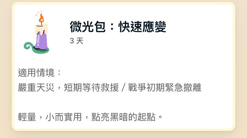 謝謝你支持備光計畫的「微光包」!你的參與,將幫助我們持續更新、整理清晰易懂的最新基礎備災指南,讓更多台灣人能快速開始準備,守護自己與家人的日常。
