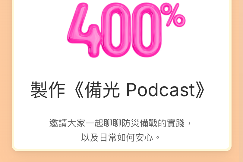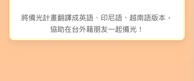 謝謝你支持備光計畫的「恆光包」!你的參與將協助我們建立長期備災生態系:給在台外籍朋友的多語版指南;營運備光的交流社群。