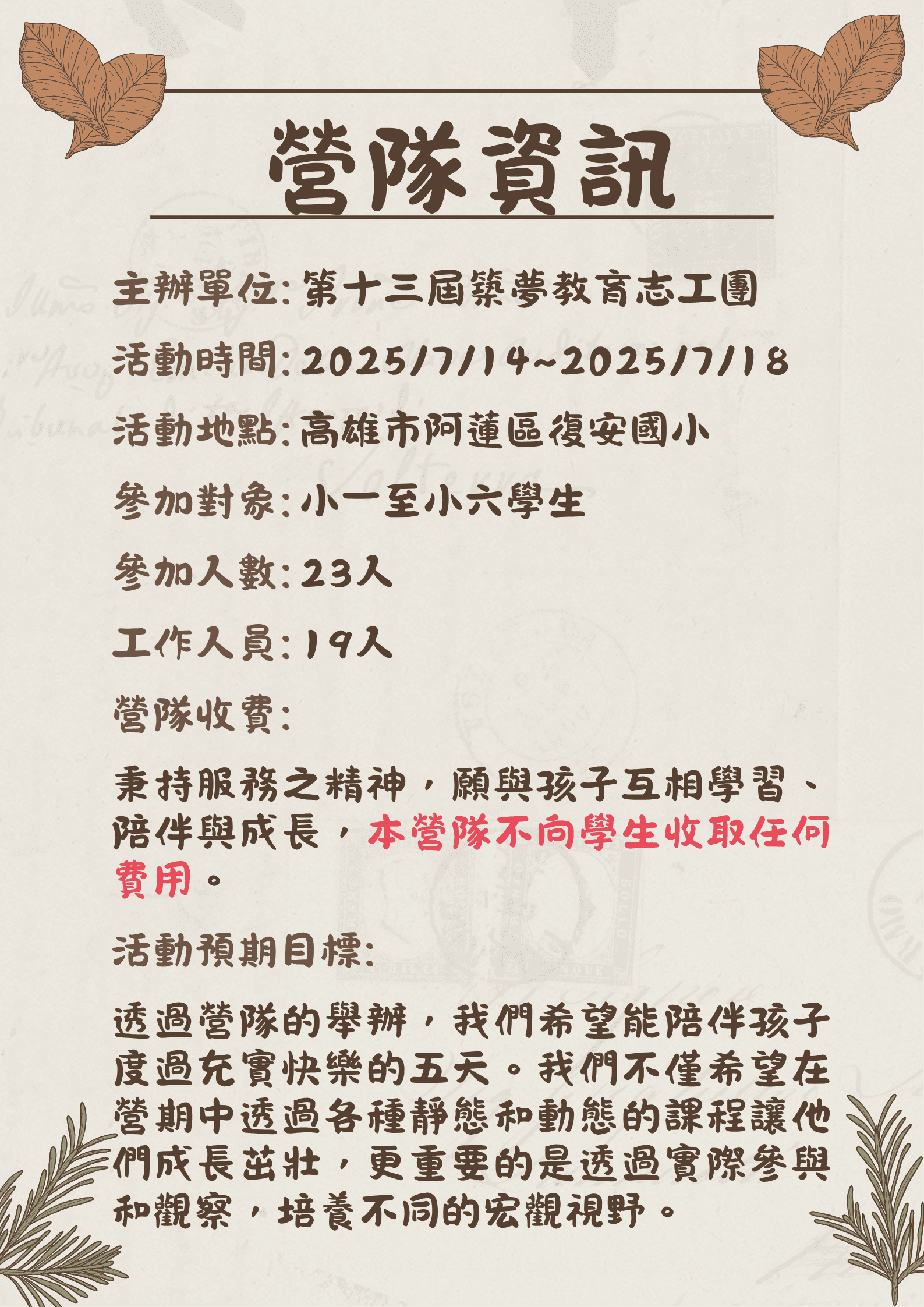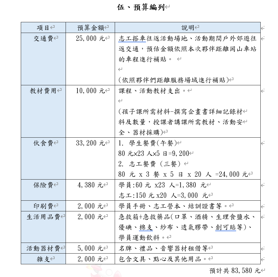 • 若募資成果超過目標,超出金額將留用下一屆偏鄉暑期教育服務營使用。