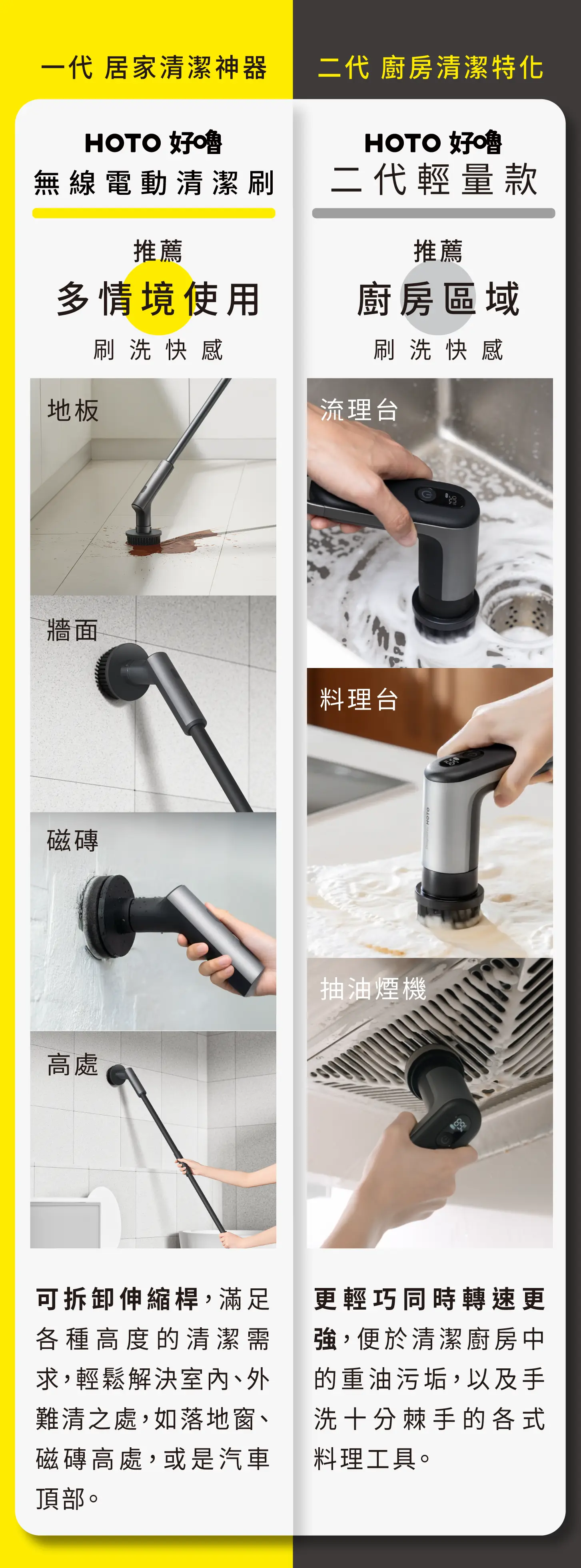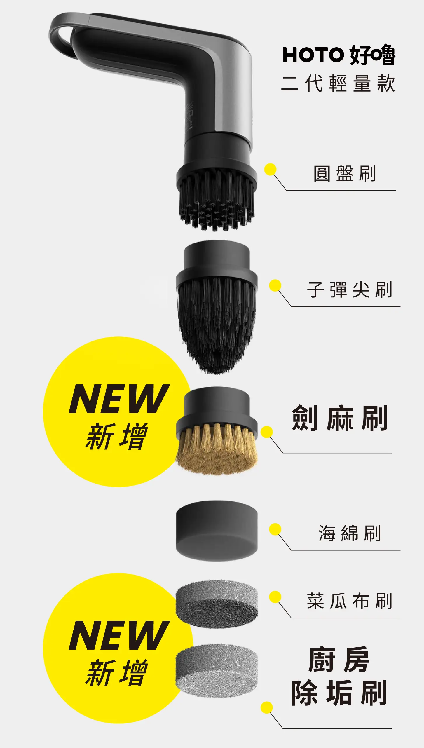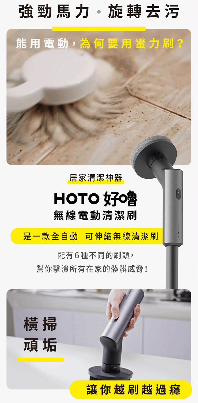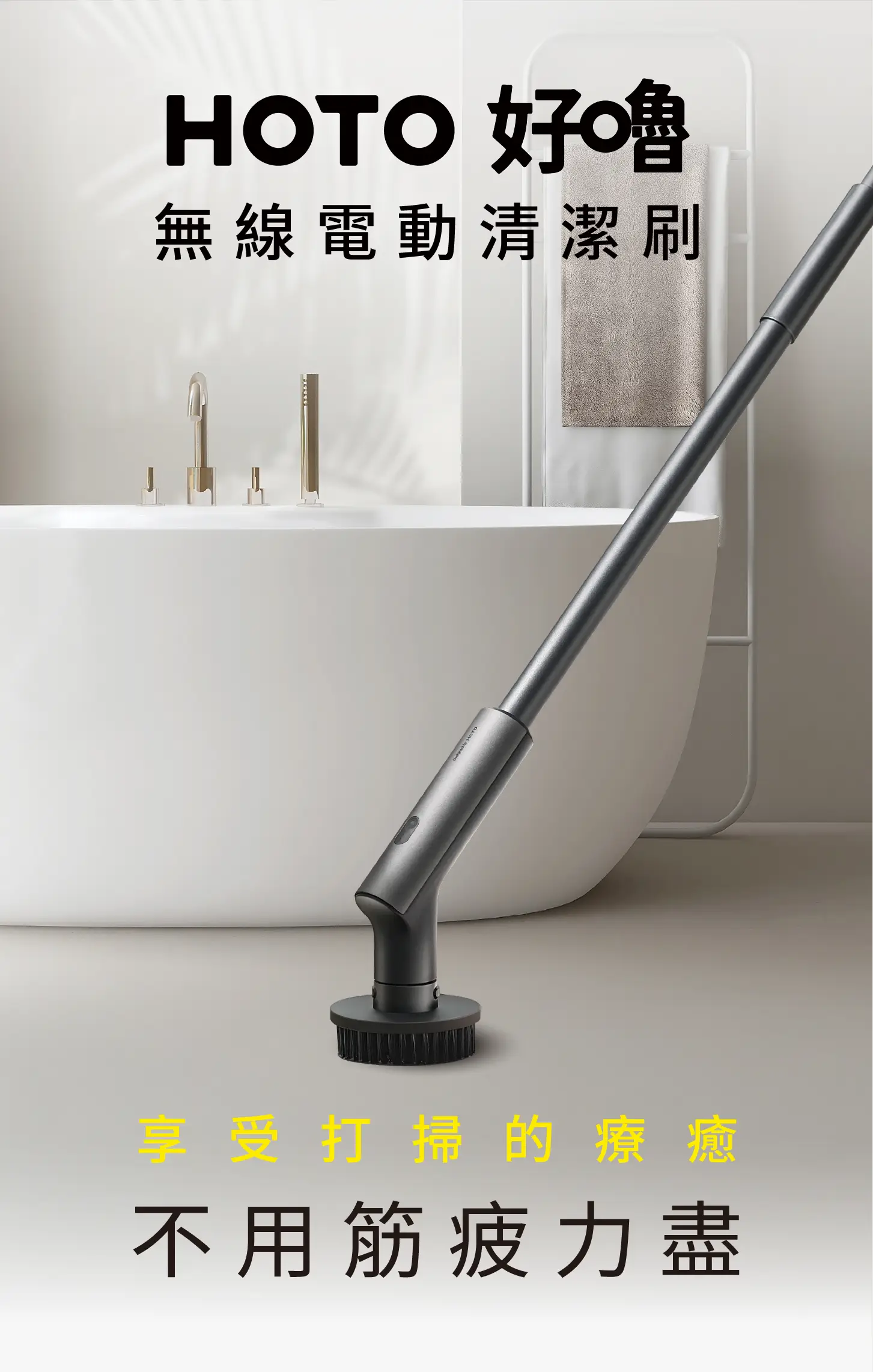 【 HOTO 好嚕 無線電動清潔刷 】是一款全自動、可伸縮的無線清潔刷。配有6種不同的刷頭,幫你擊潰所有在家的髒髒威脅!
