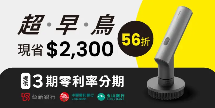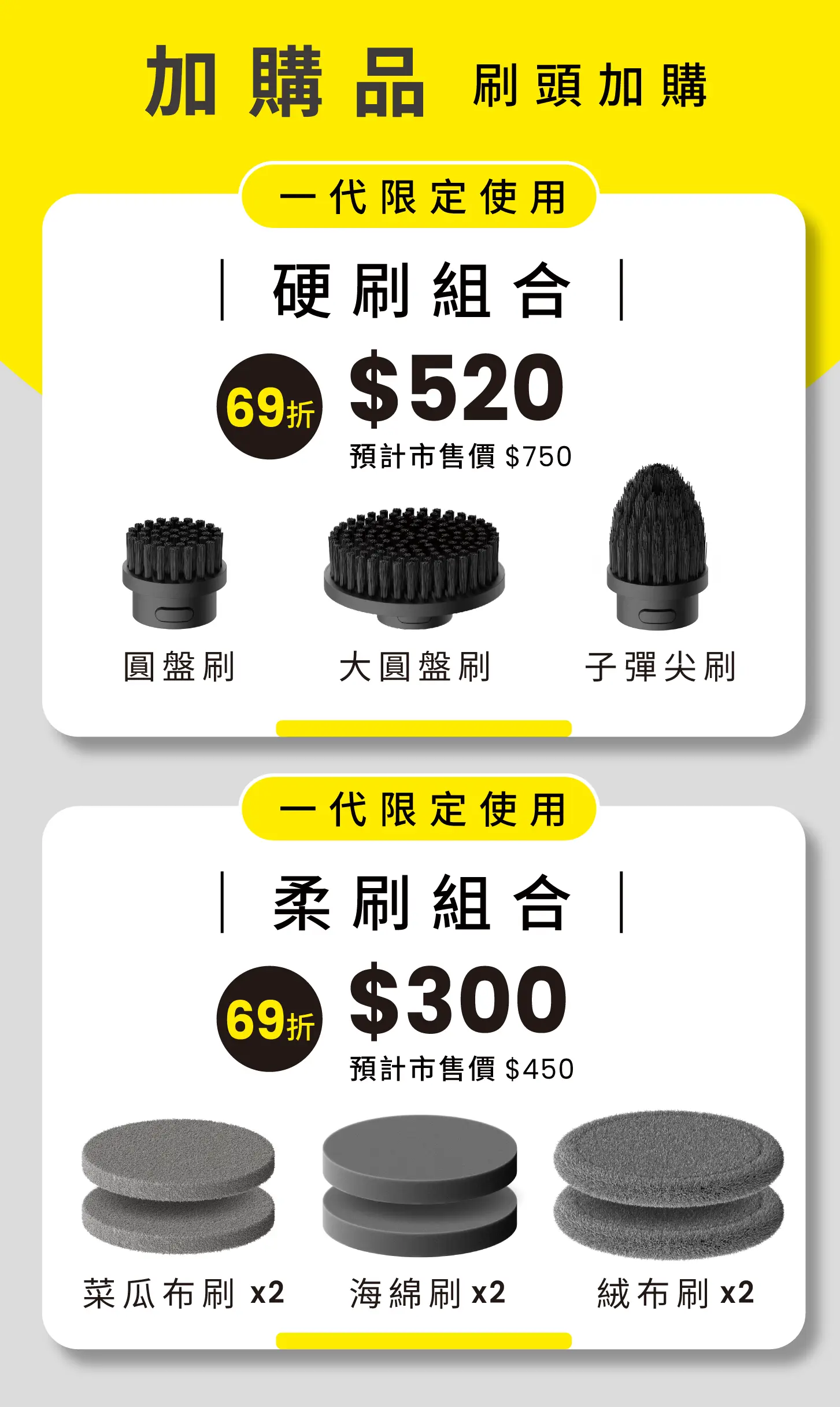 選擇困難?那通通帶走 ✨ 【 55 折優惠|現省 $4,200!】 一代 內含刷頭: *圓盤刷|大圓盤刷|子彈尖刷 *海綿刷|菜瓜布刷|絨布刷 二代 內含刷頭: *圓盤刷|子彈尖刷|劍麻刷 *海綿刷|菜瓜布刷|廚房除垢刷 ✅ 分期 三期零利率 ✅ 期間享全台免運 ✅ 產品保固一年