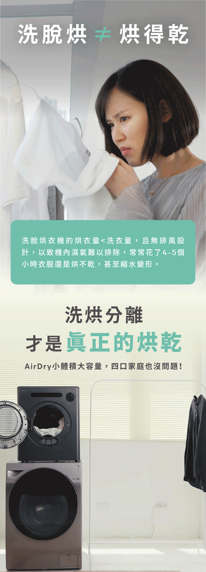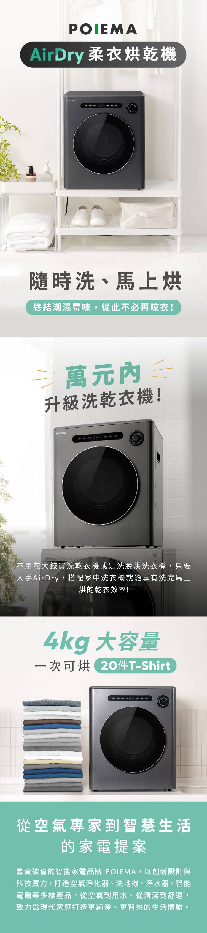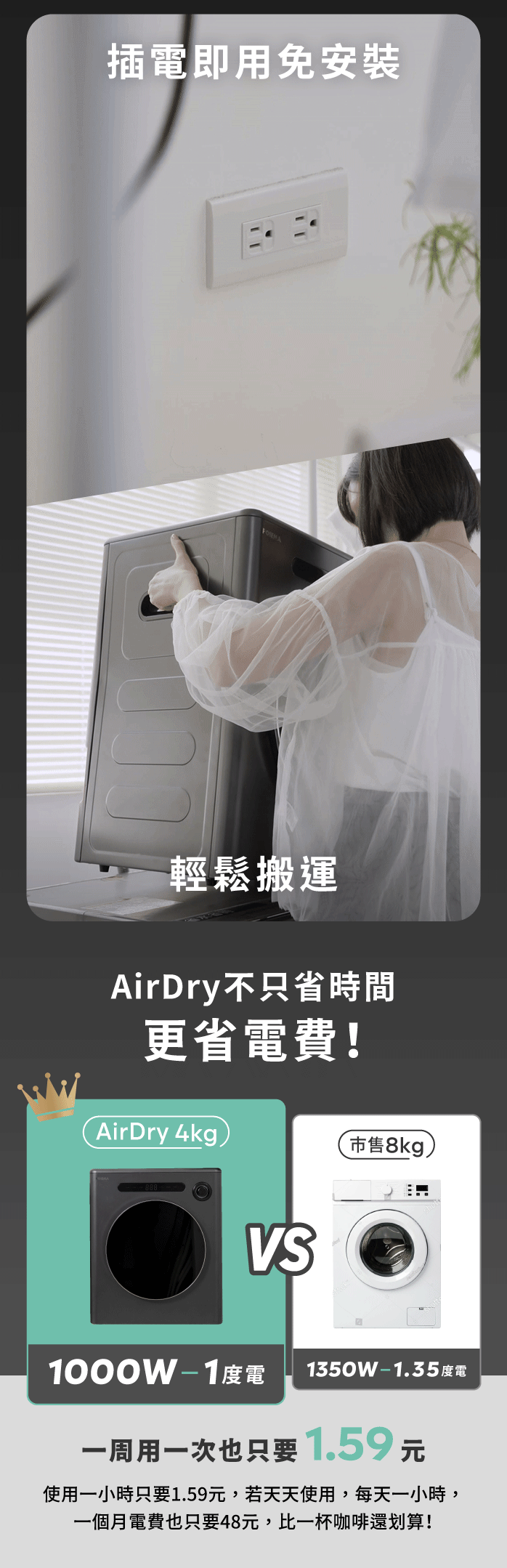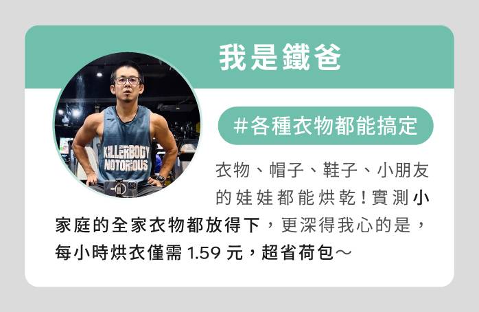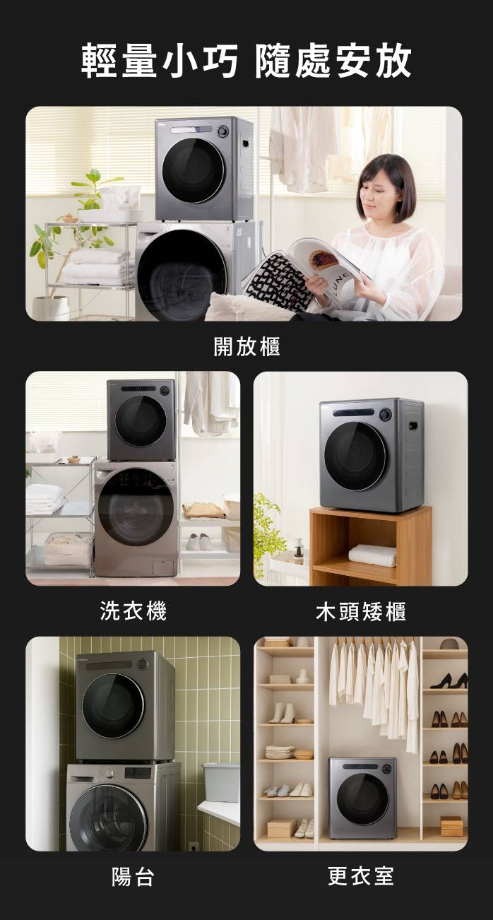 4KG 大容量,四口家庭也沒問題,輕巧體積設計,一人也能輕鬆搬起,家中角落、閑置空間都放得下。從此不必再晾衣,和潮濕悶臭說掰掰!