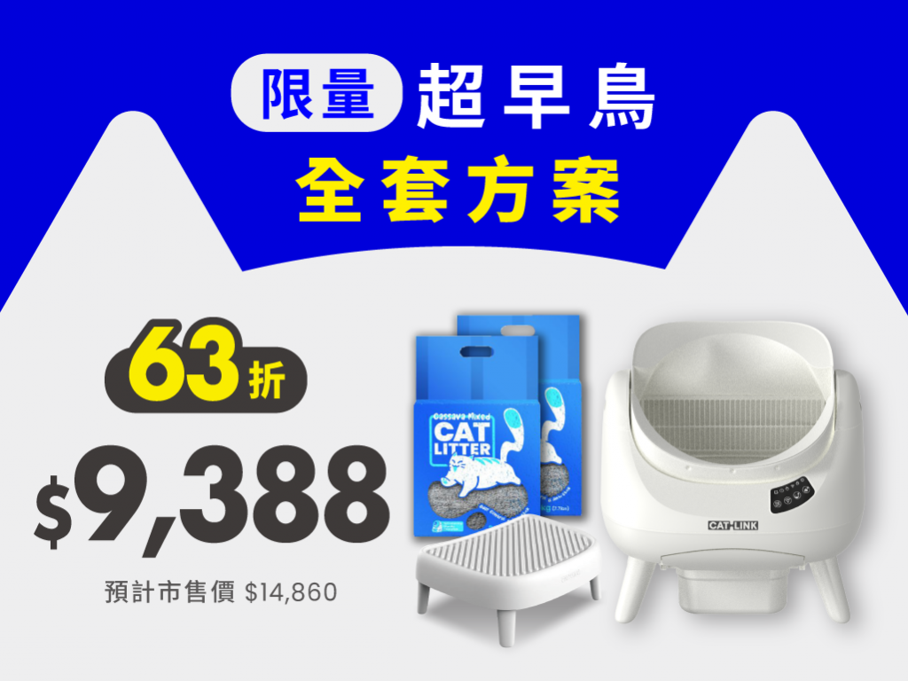 超早鳥全套方案|現省 $5,472 ✅ 包含: 增高落砂墊x 1 垃圾袋 1 捲(20只) 全防墊*1 除臭凝膠*1 使用說明書 🎁 加碼贈送: 木薯混合小白砂*2