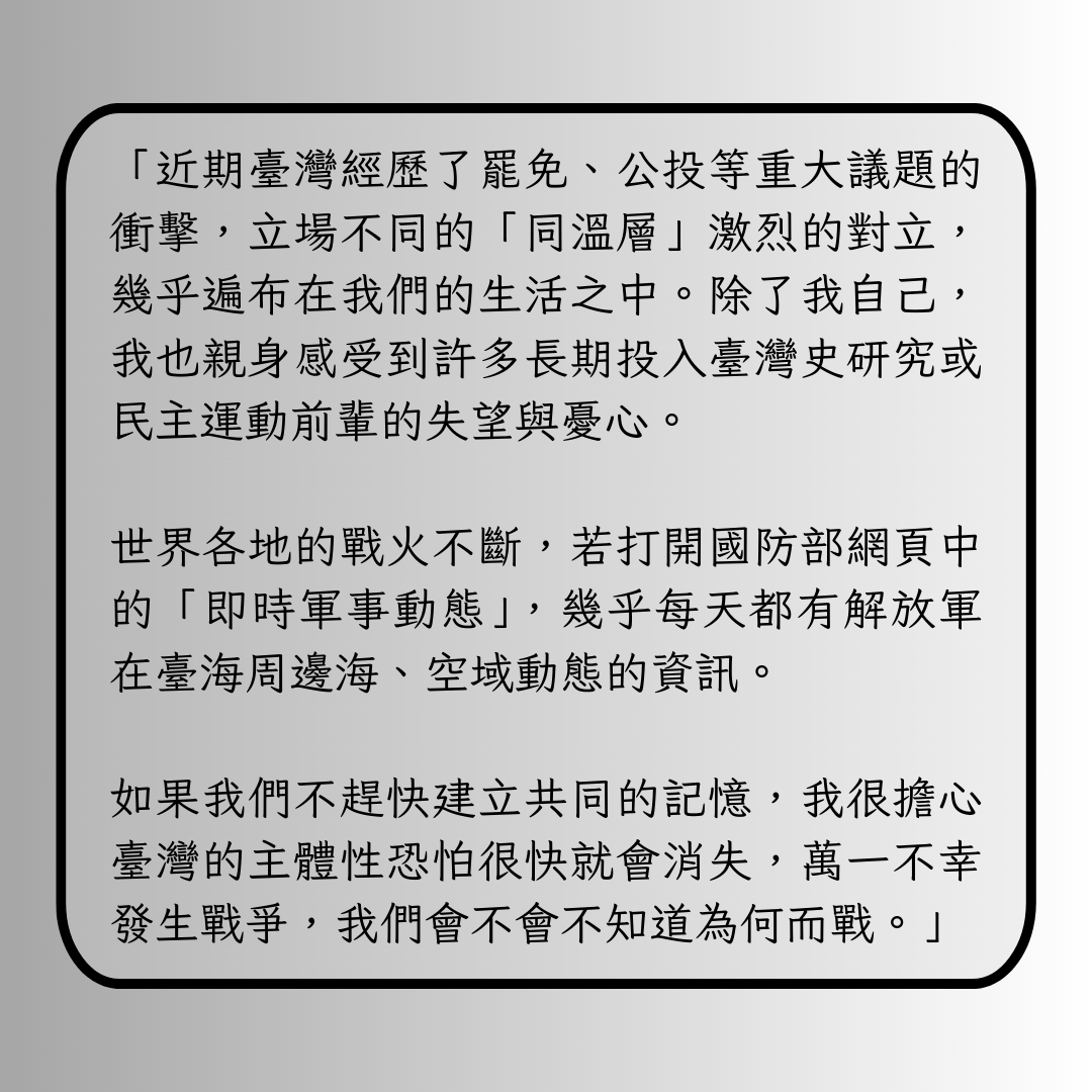 Completing Memories Frozen in Time is just the beginning. Through lectures, dialogues, readings, and articles from this fundraising project, we aim to spark conversations that bridge generations. By seeing the present through the lens of history—and understanding life in Taiwan under the weight of great powers—we hope to foster a shared resolve to face these challenges together.