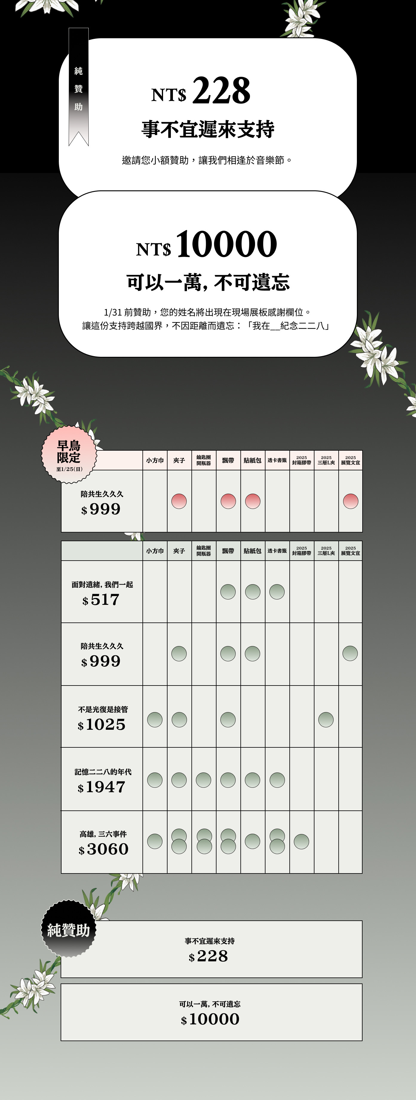 1/31 前贊助,您的姓名將出現在現場展板感謝欄位。讓這份支持跨越國界,不因距離而遺忘:「我在__紀念二二八」
