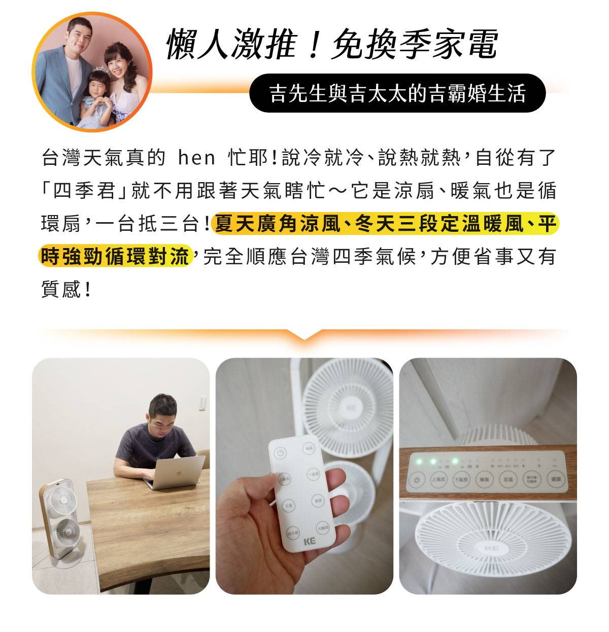 【 嘉儀KE 四季君 】冬天快速提高室內溫度,保持恆溫;夏天也不需收納,繼續吹出強勁涼風。雙扇多方位循環,以強大的氣流讓空氣流通。