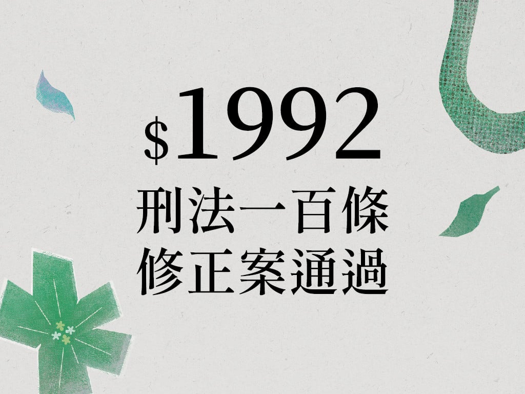 1992/05/15,立法院三讀通過「刑法一百條」修正案,將「以強暴或脅迫著手實行」具體條件新增至條文中,人民終於不再因思想而獲罪,達到真正的言論自由。