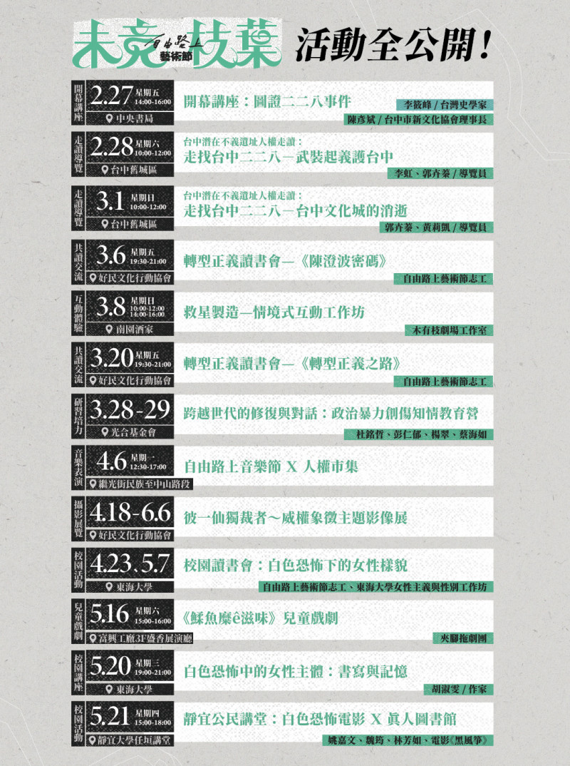 合作單位 | 台灣中社、光合基金會、大千電台寶島聯播網、陽光城市發展協會、台灣大地文教基金會、史明教育基金會、鄭南榕基金會、民間司法改革基金會台中辦公室、嗨風裏協會、回甘、默契咖啡、野火樂集、探霧者工作隊、東海大學女性主義與性別工作坊、台灣戒嚴時期政治受難者關懷協會