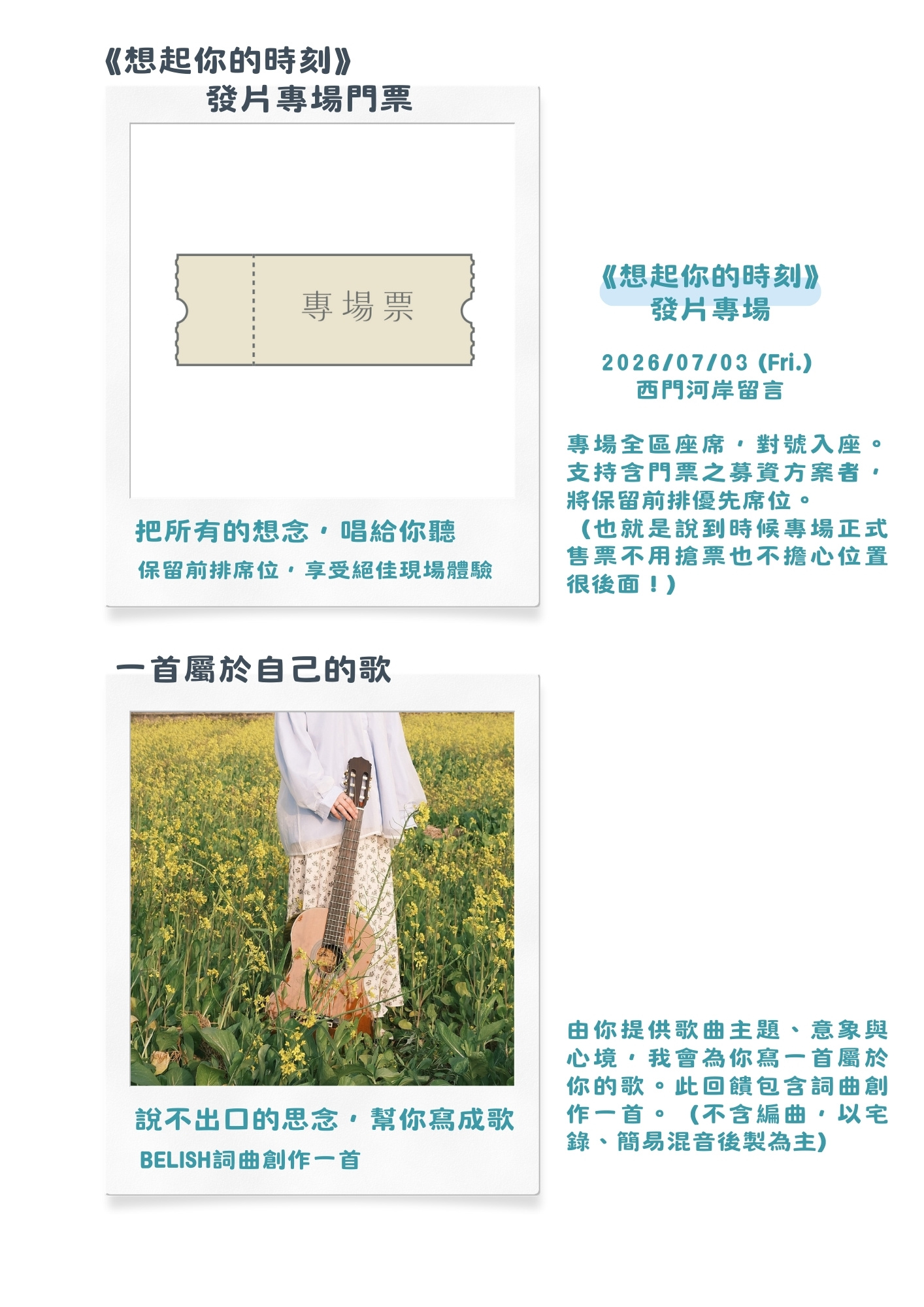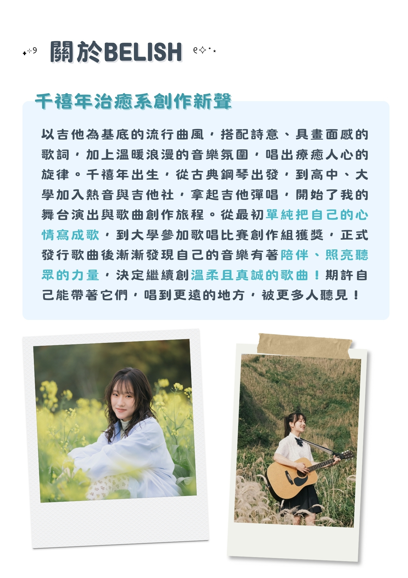 千禧年治癒系創作新聲BELISH,以吉他為基底的流行曲風,搭配對話式、具畫面感的歌詞,打造出溫暖浪漫的音樂風格,深受樂迷喜愛,唱出療癒人心的溫柔旋律。擁有豐富演出經驗,包括個人售票專場、音樂祭、校園演唱會等。2024年底,推出首張創作 EP《3 Steps Closer》,2026 年BELISH即將發行個人首張專輯《想起你的時刻》,繼續透過音樂溫柔陪伴歌迷一同好好生活。