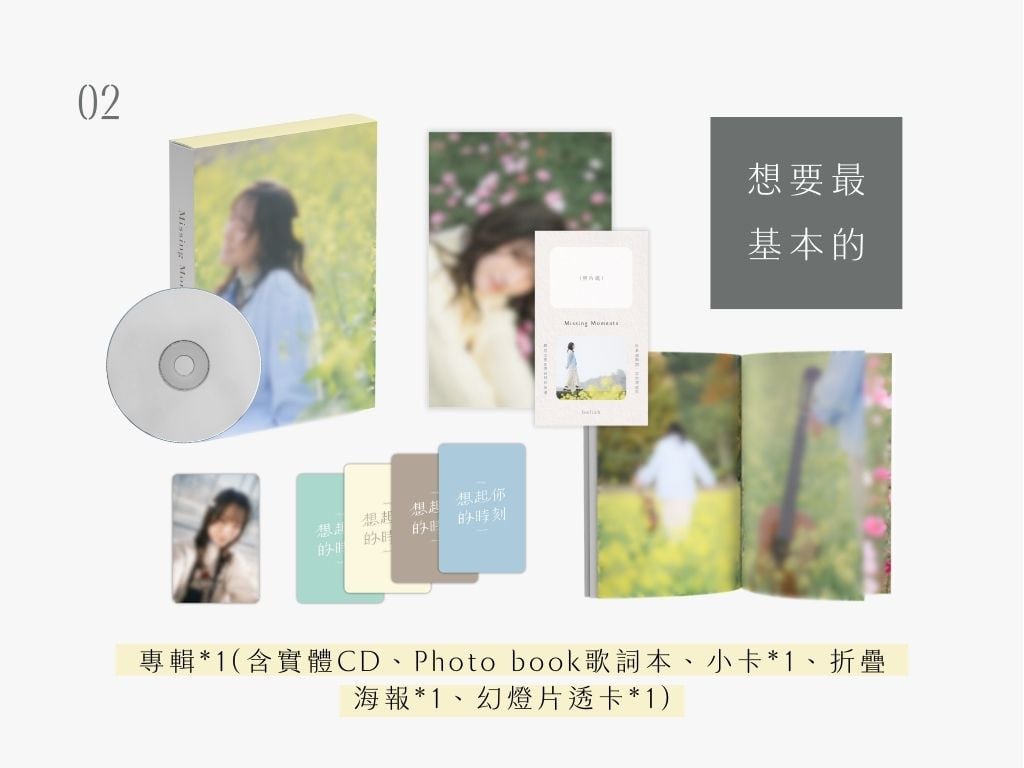 方案回饋內容|《想起你的時刻》實體專輯*1 專輯含實體CD、Photo Book歌詞本、小卡*1(共四款隨機)、折疊海報*1、幻燈片透卡*1