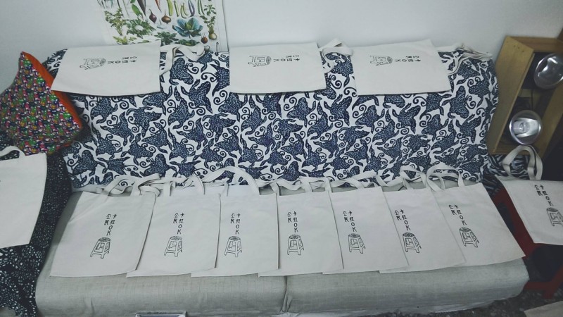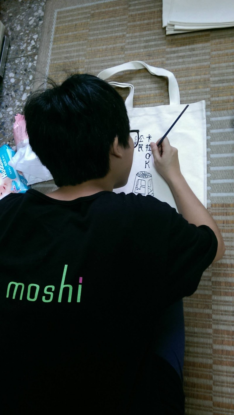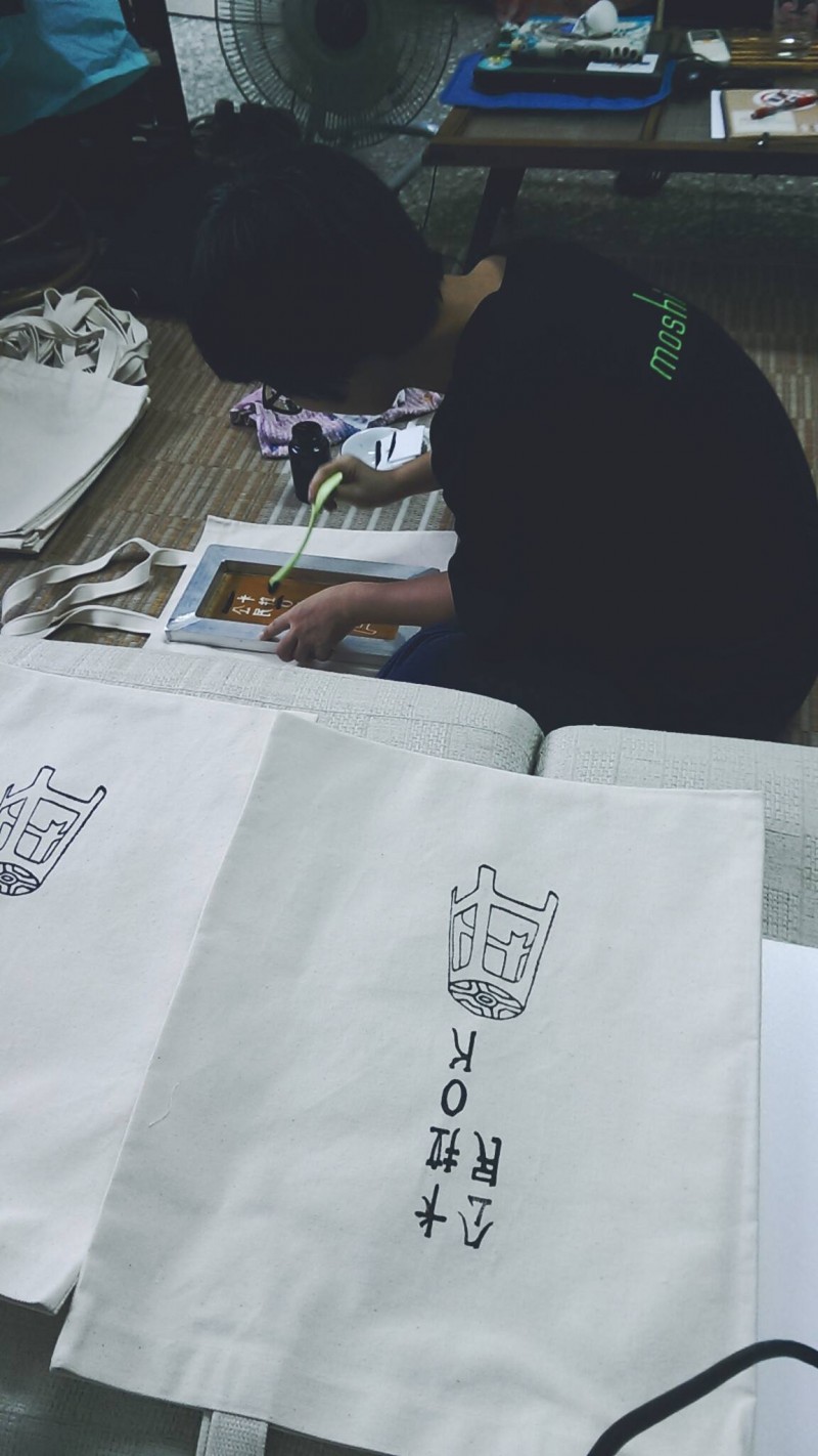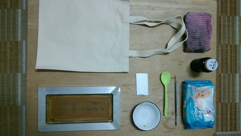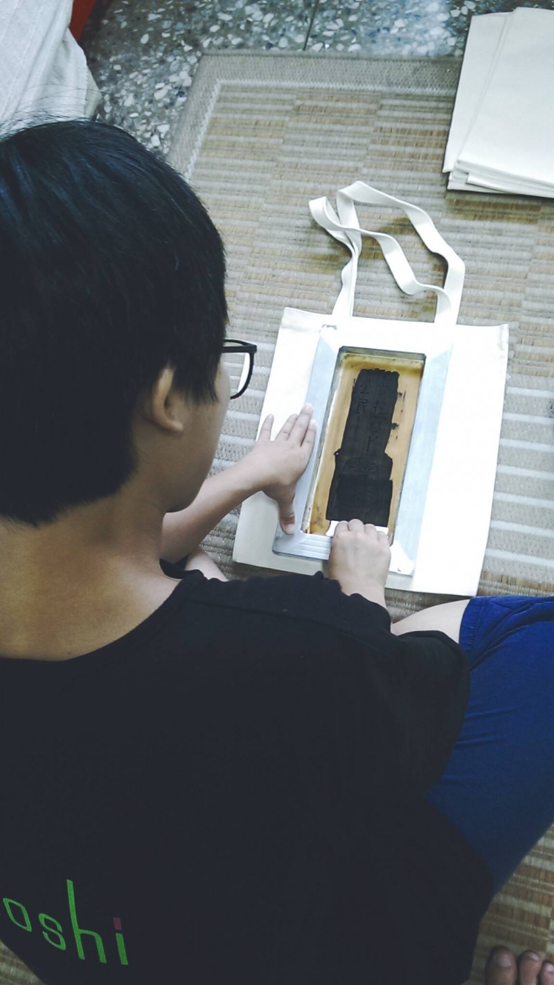 抹布。(1)把絹版壓在空白胚布袋上,把油墨放在絹版上。