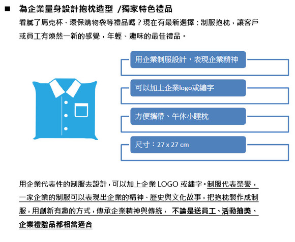 《客製化制服抱枕》不論是大的、小的、有領結、沒領結、國民領、立領、有口袋、沒口袋,從國小到大學甚至是公司或任何單位(如:郵局、警察),只要是制服都可以做,尺寸為27*27cm,不管是剛畢業想要邀同學一起將制服做成抱枕,或者公司想要凝聚員工向心力,將公司制服做成午睡枕送給員工,都是不錯的選擇。