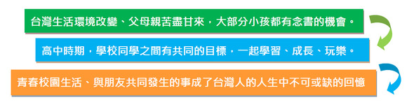 - 患難精神:在高中時期因為學校內的同學有共同的目標,想要考好大學或找到好工作。在學校中一起學習成長、在生活中和父母溝通磨合,共同的經歷變成珍貴回憶。