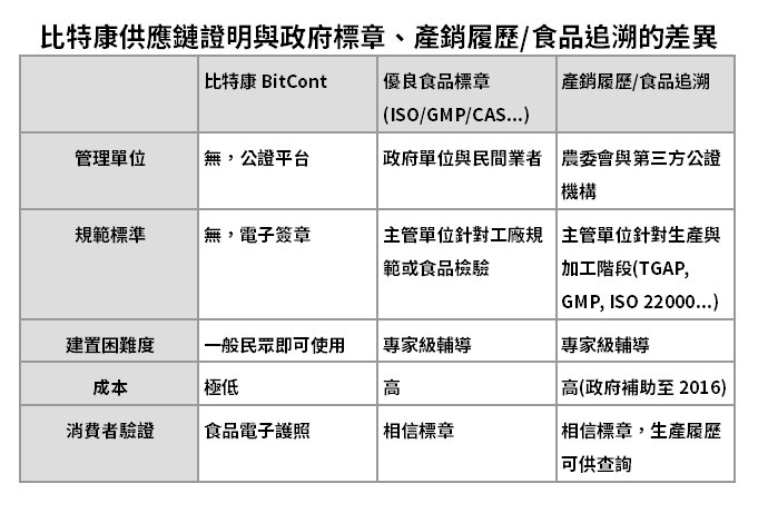 比特康BitCont是個開放平台,只作實名制用戶審核。與檢驗單位、規範標章機構或政府的產銷履歷完全不同,此供應鏈證明電子簽章平台,任何企業、生產者、檢驗單位、消費者,皆可自由使用,如同食安物聯網。