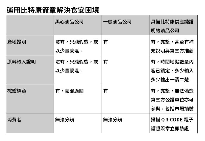 比特康供應鏈證明最大的功用,是讓優良食品運用群體供應鏈的力量互相稽核並提出證明,讓黑心商人很難找到機會欺負消費者。因為一個立即可驗證的透明化平台,黑心食品就無所遁形,一旦供應鏈產生任何風險,消費者也可立即得知。
