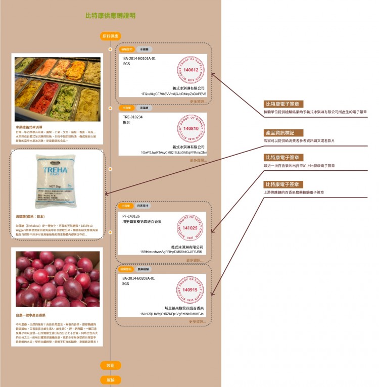申請比特康證明以冰淇淋為範例,當消費者掃描QR-CODE即可出現食品電子護照: