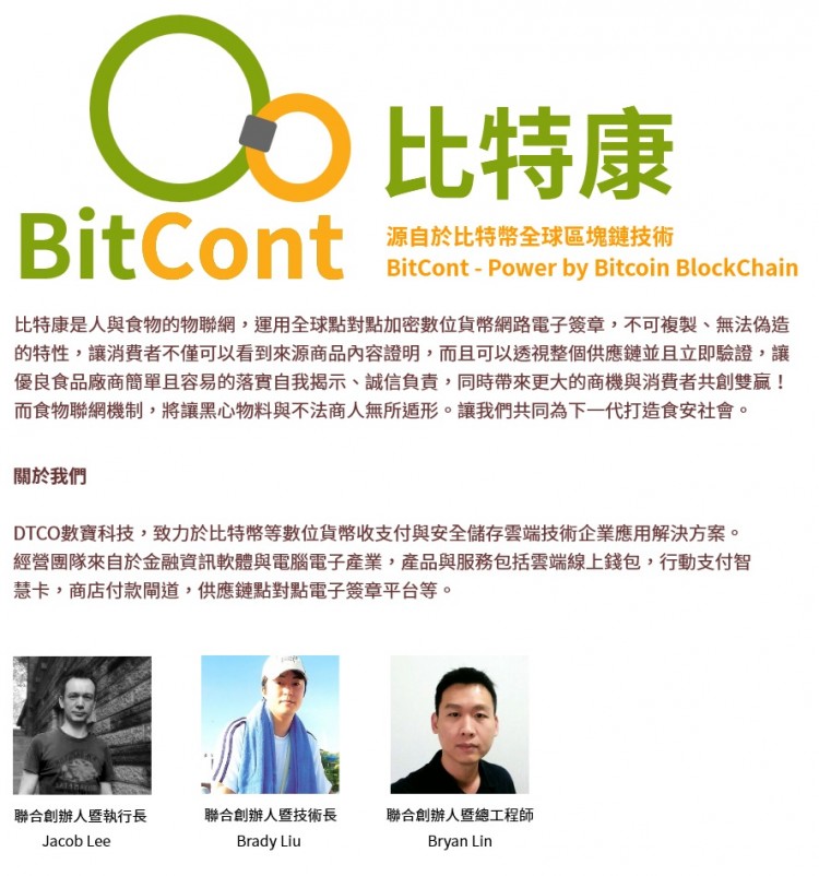 運用全球數位貨幣網路,去中央化、無法偽造的特性,讓消費者不僅可以看到來源商品內容證明,而且可以透視整個供應鏈並且立即驗證真偽。比特康BitCont的功能,不在於取代各種檢驗標章或者產銷履歷制度,而是彌補其不足,讓消費者買到如商品標示的安心產品,包括產地、原物料來源、供應商、各種標章的真偽,讓黑心物料與不法商人無所遁形。