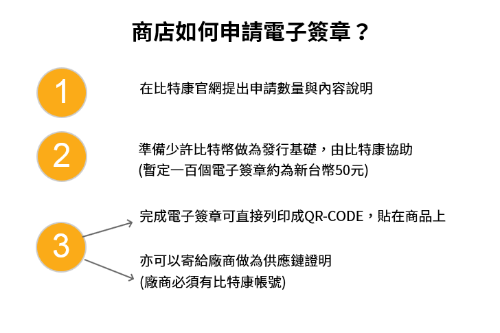 申請比特康電子簽章,如同申請發票,只要準備少許比特幣,或由比特康協助。以申請一百個電子簽章為例,準備約新台幣50元,即可做成一百個電子簽章,這一百個簽章可以記載品名、數量或服務內容,在比特康官網產生QR-CODE,列印出來張貼在商品上。或者,上游廠商將電子簽章寄給下游廠商,做為供應鏈證明。日後;當消費者掃描QR-CODE,即可獲得供應鏈證明的相關資訊。