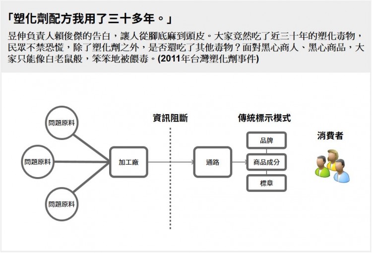 傳統的標章模式已經淪陷,消費者只能選擇相信銷貨架上的標示,無法確認真偽。任何標章 都只是片面之詞,消費者資訊被混充蒙蔽的可能性非常高。我們需要消費者真正心安,而不是只具象徵意義的符號。