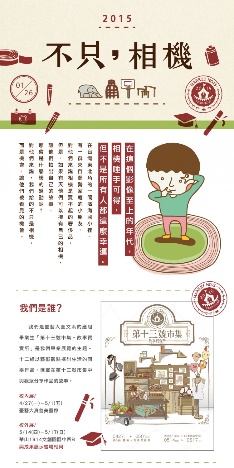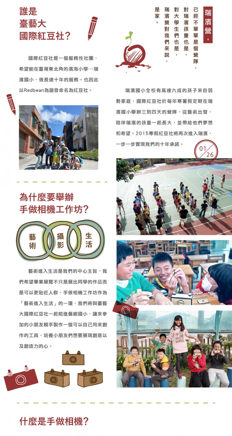 在這個影像至上的年代,相機唾手可得,但不是所有人都這麼幸運,在台灣東北角的一間濱海國小裡,有一群來自弱勢家庭的小朋友,相機對他們來說是奢侈品、是買不起的玩具。我們想帶著小朋友們一起回到「照相」最原始的樣貌-自己動手做一台紙相機,學習「照相」到底是怎麼回事,真真實實的享受創作的過程。
