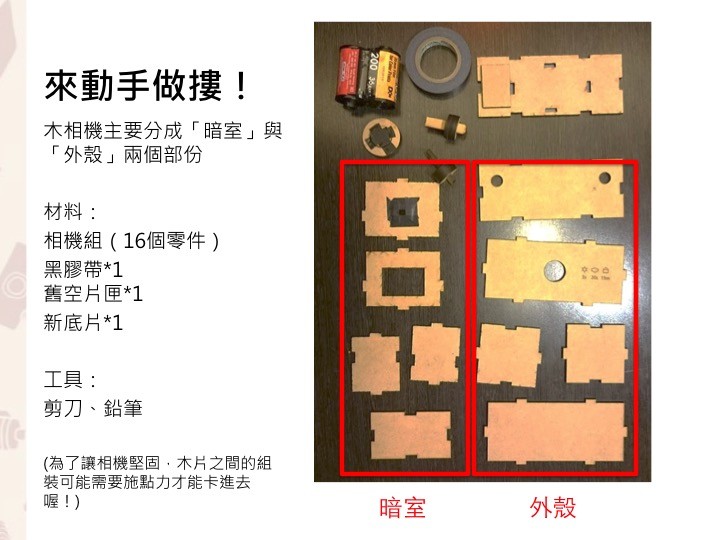 紙相機製作材料包兩份+135空白底片兩捲+徽章兌換券一張+感謝卡一張