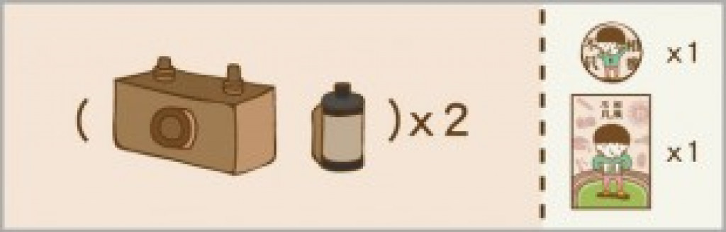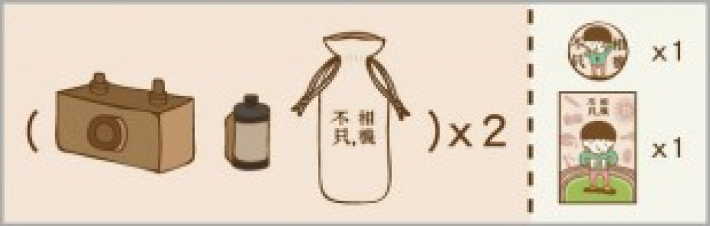 紙相機製作材料包兩份+135空白底片兩捲+相機隨身束口袋兩只+明信片兩組+活動成果冊兩本+ 參加展覽期間手做相機工作坊(兩位)+徽章兌換券一張+感謝卡一張