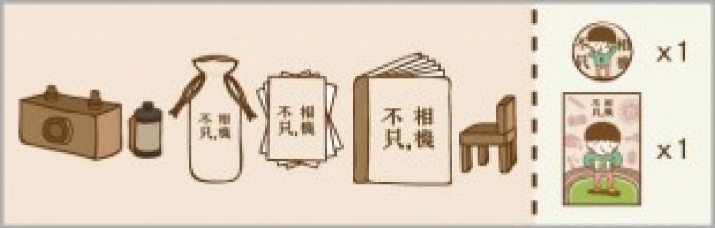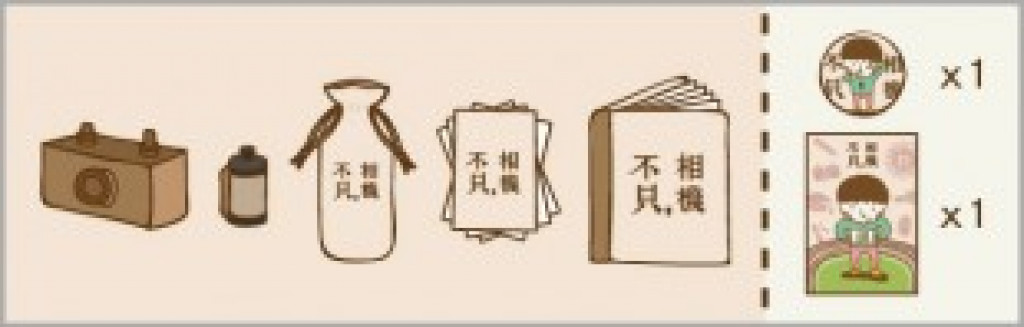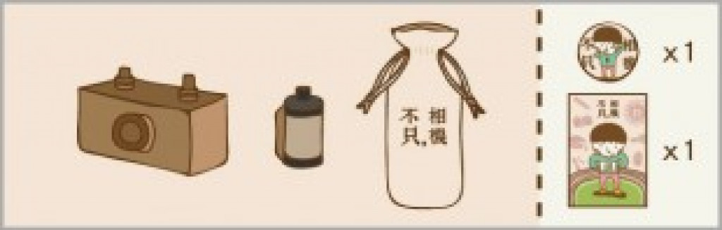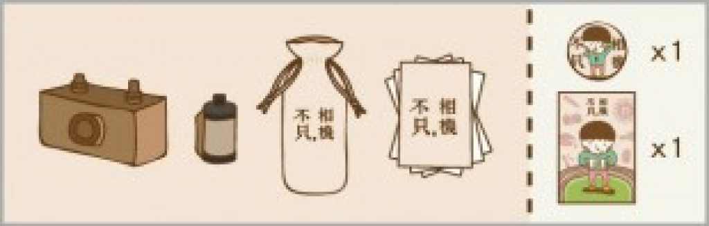 紙相機製作材料包一份+135空白底片一捲+相機隨身束口袋一只+明信片一組+活動成果冊一本 + 參加展覽期間手做相機工作坊一位+徽章兌換券一張+感謝卡一張