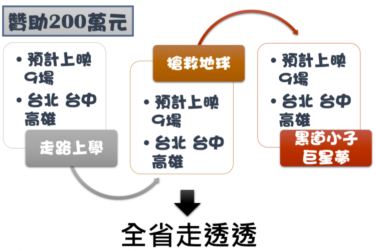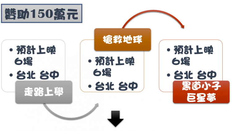 影展會依照資金分配比例執行計畫,超過100萬元的部分將作為中南部展演的經費,希望可以在愛中感動更多更多的家長和青少年學子,幫助他們找到人生的目標和方向。