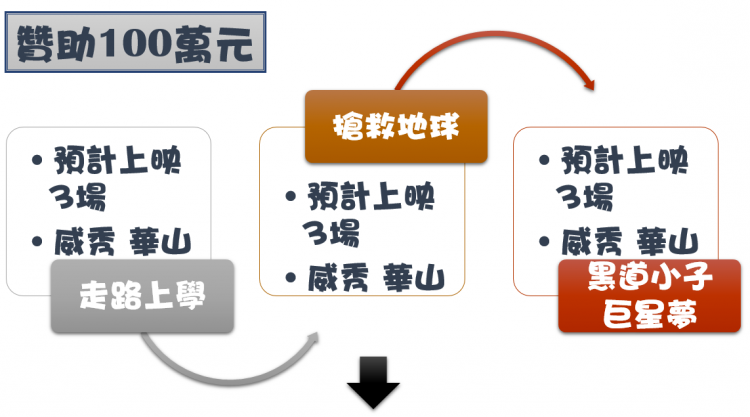 影展三部曲 募資金額為100萬元,贊助金額愈高,影響青少年的人數愈多,同時,因著支持者眾多之故,可以聚集人氣,為小型影展贏得電影院線協商的優勢,為支持者及青年學子爭取更多的電影廳院及較佳的展演時段。本影展堅決相信--透過你、我、他小水滴般的力量,終能聚集成河,匯流成海。