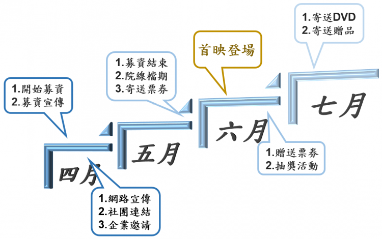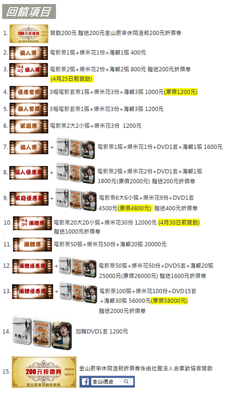 • 1.本案於募資成功後,才會開始寄送電影票劵。 2.影展排定的日期及電影院線將於五月中公布及通知。 3.影展上映時間可能因院線檔期之故產生更動,更動時間最晚不超過6月20日。 4.回饋商品預訂於影展結束後20天寄送,運費採貨到付款。