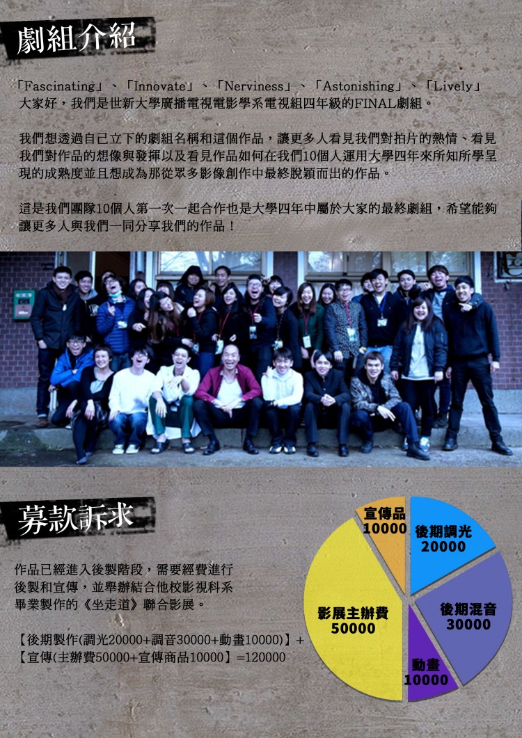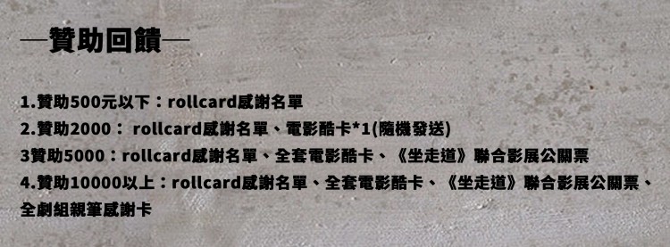贊助10000以上:rollcard感謝名單、全套電影酷卡、《坐走道》聯合影展公關票、全劇組親筆感謝卡