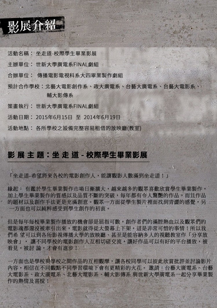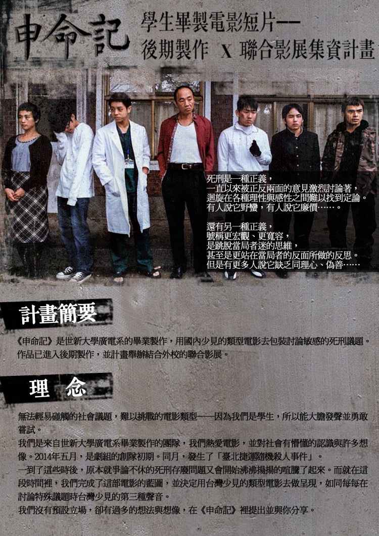 《申命記》是世新大學廣電系的畢業製作,用國內少見的類型電影,去包裝、討論敏感的死刑議題。作品已進入後期製作,並計畫舉辦結合各大影視科系畢業製作的聯合影展。