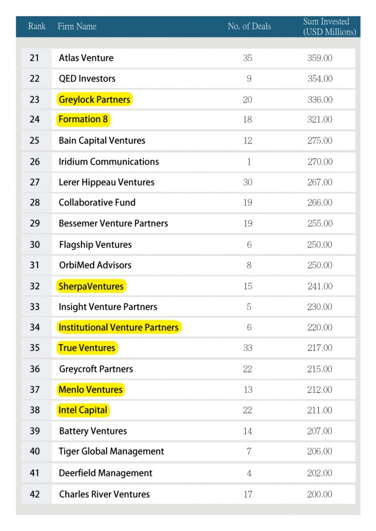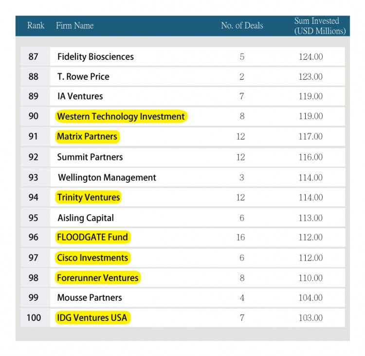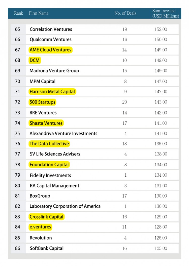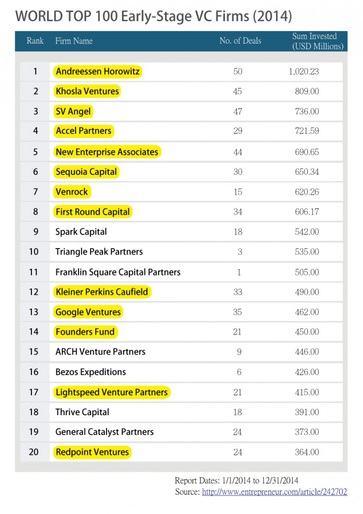 根據 entrepreneur.com 所發布的資訊,去年專注於早期階段投資的世界百大創投,有