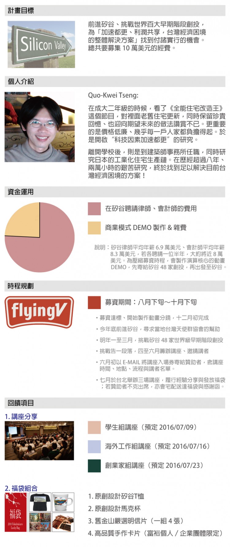 這個專案一共需要 10 萬美元的經費,其中 8 萬美元的預算是用在矽谷募資,必須在當地聘請律師、會計師的費用。然後,期限設定是兩個月,希望各位能協助我、在第一個月就順利達到募資標的,第二個月我就可以聘請動畫團隊、將商業模式做成