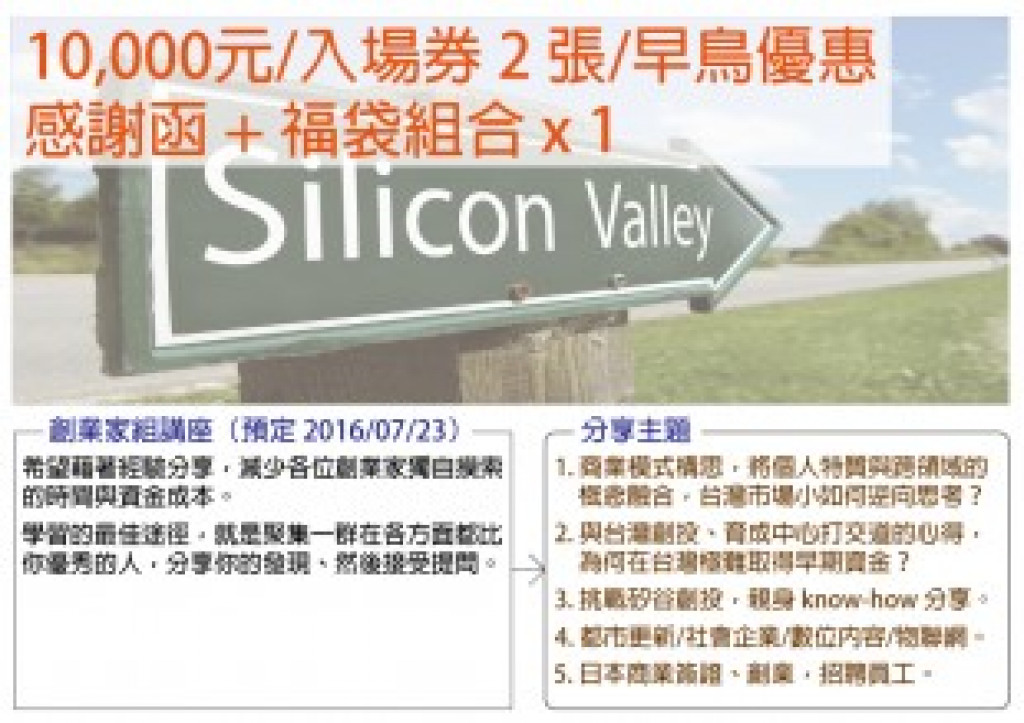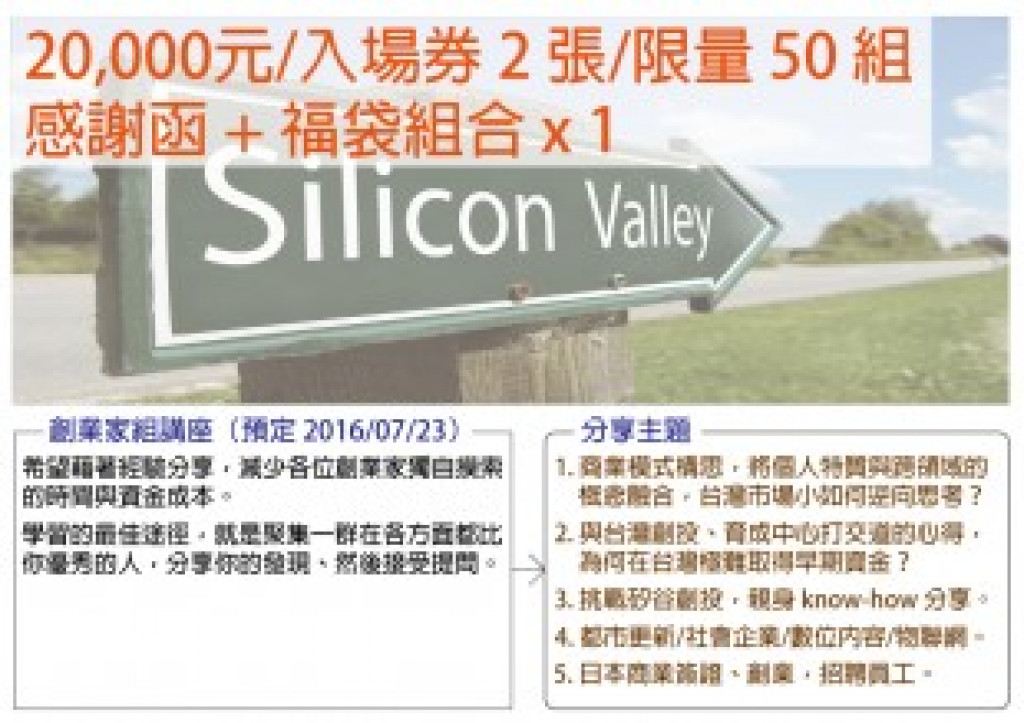 矽谷創投這幾年,逐漸將目光聚焦在亞洲市場,我們必須把握這個機會。如果你有志於創業,贊助這個專案,讓我替你們撞開這條通往矽谷的大門。