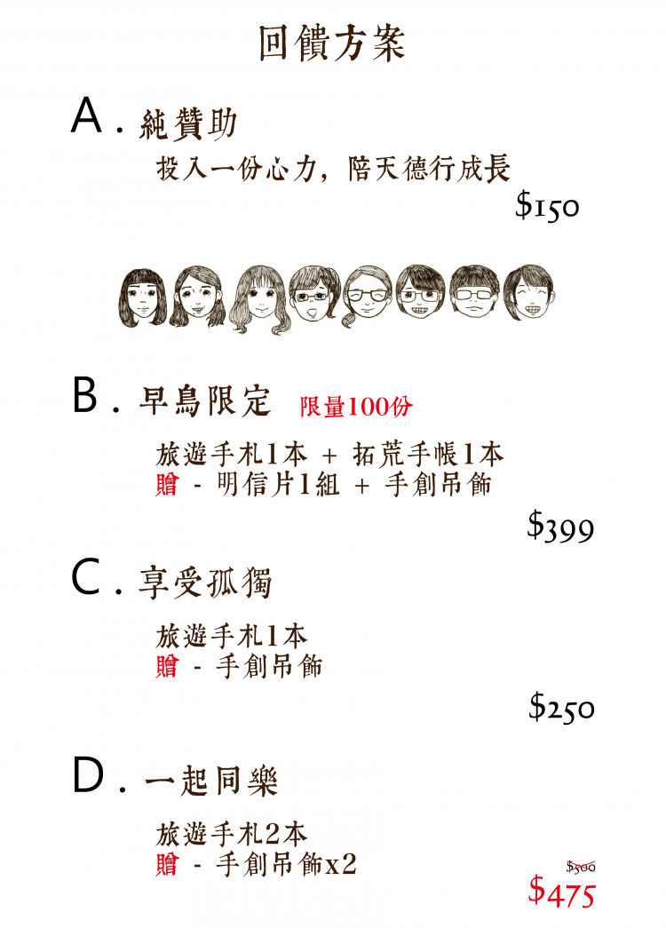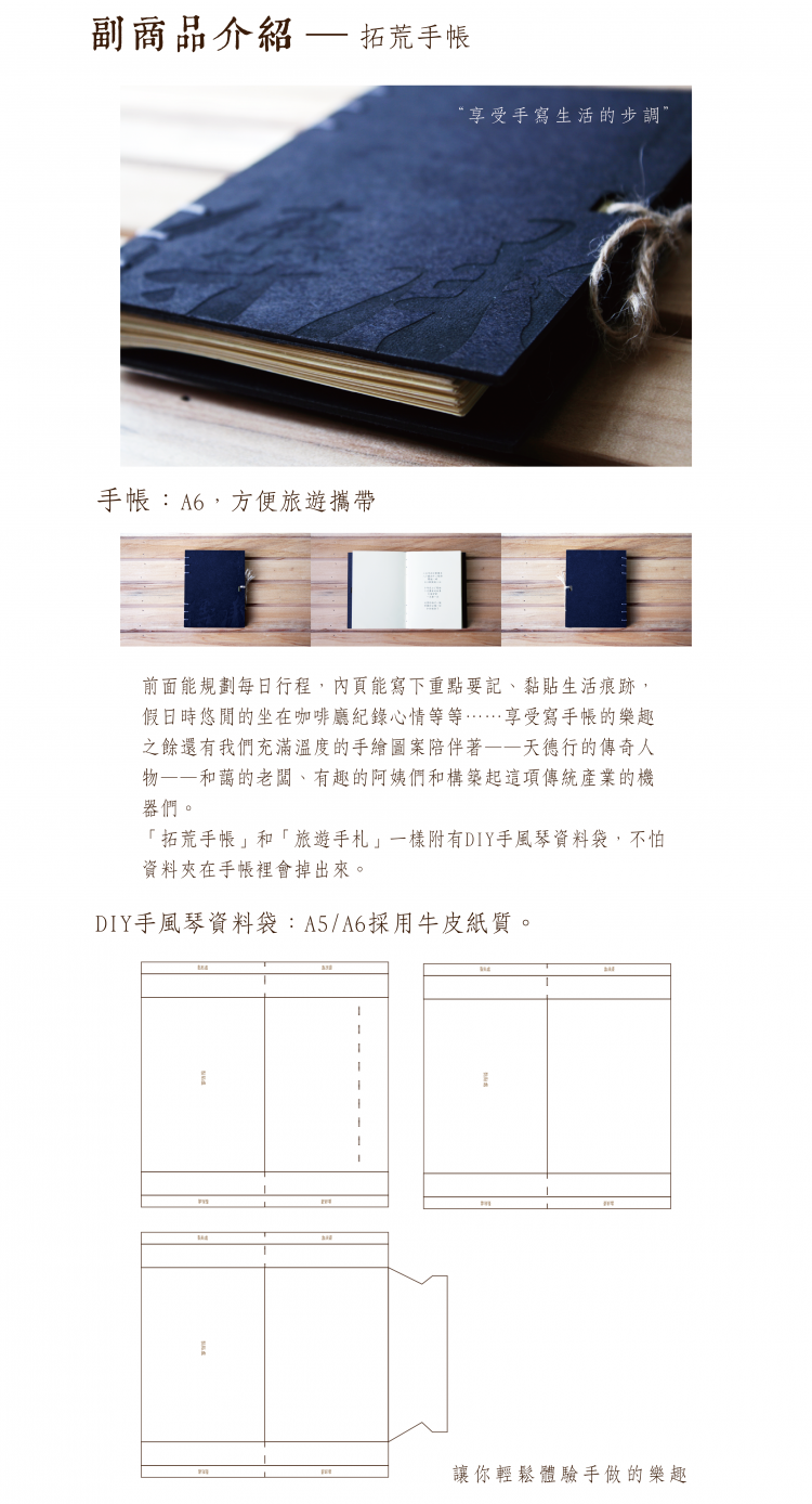 • 本產品皆經繁複的手工程序製作而成,每本成品都是工廠阿姨、伯父們精心的手作,均可能稍有誤差,而過程中我們以最嚴謹的態度來嚴格把關,但細節部分仍難以達成如機器生產般的一致性,若有此現象,皆屬正常。 手縫手帳封面因以雷雕機製程,產品外觀經處理後仍會參雜些微粉末,而內頁以手工手縫製程,每本均有差異,若造成您的不便,儘請見諒。 目前展示於頁面的產品為少量試生產之樣品,正式生產的產品會與展示頁面之樣品略微不同。 手札、手帳皆為手工獨一無二製程,使用過程中,請勿過度操作,應加以愛惜。 因生產時辰延長,可能導致回饋項目的寄送日期延遲。